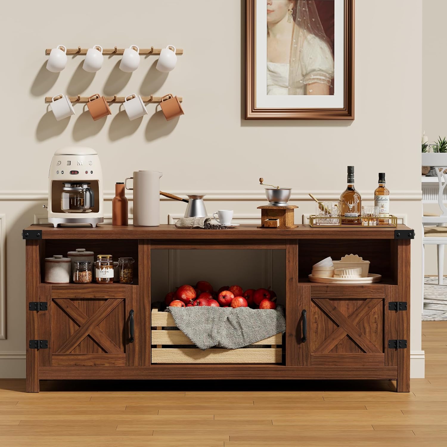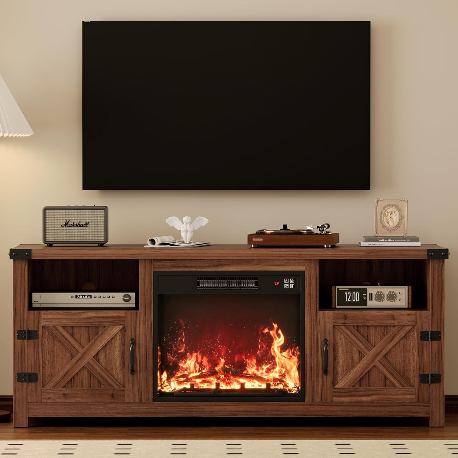 YESHOMY Fireplace TV Stand with Barn Doors and Open Display Shelf, Farmhouse Media Console with Hidden Cable Routing, Entertainment Center for Televisions up to 65+ Inch, Walnut