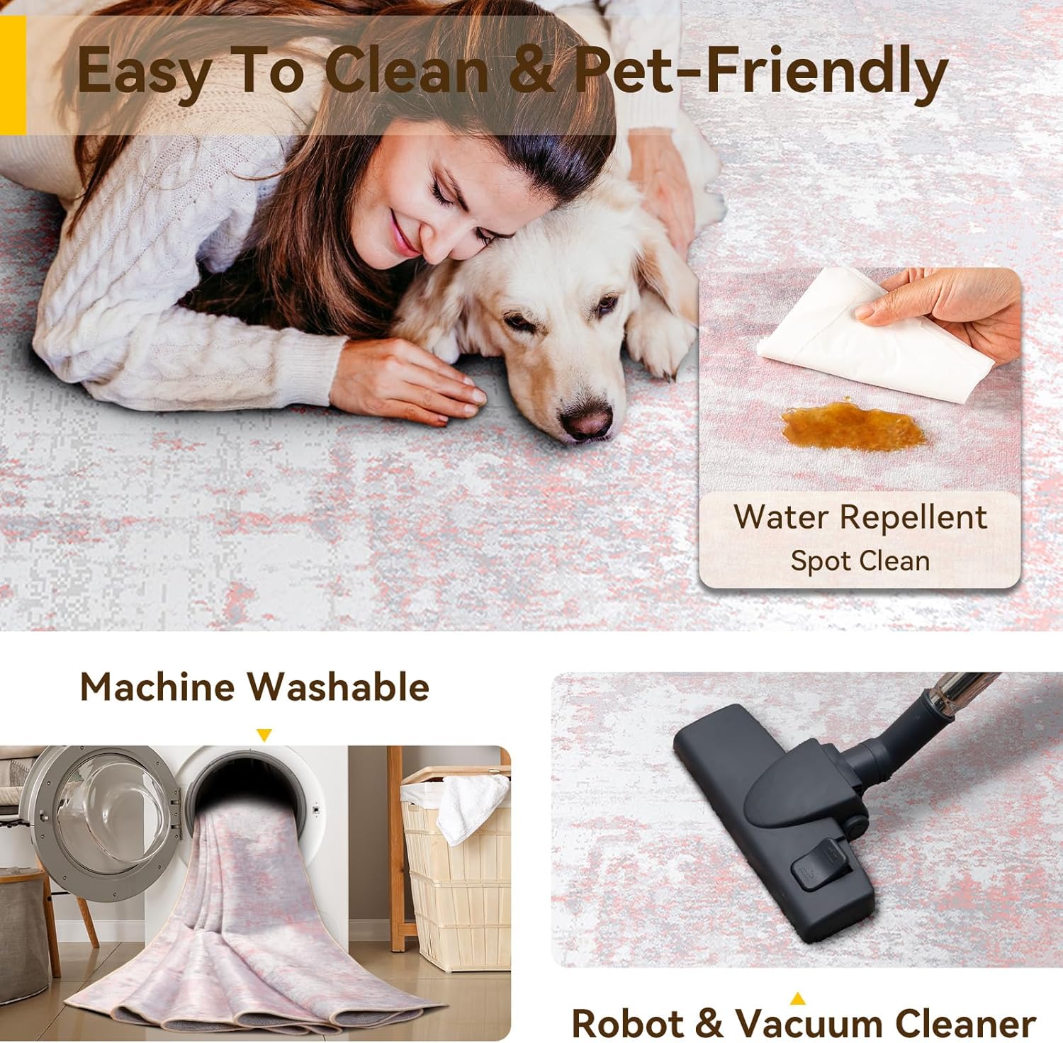 Washable Area Rugs 7'x9' Non-Slip Modern Abstract Soft for Living Room Entryway Bedroom Nursery, Print Pattern, Grey Pink