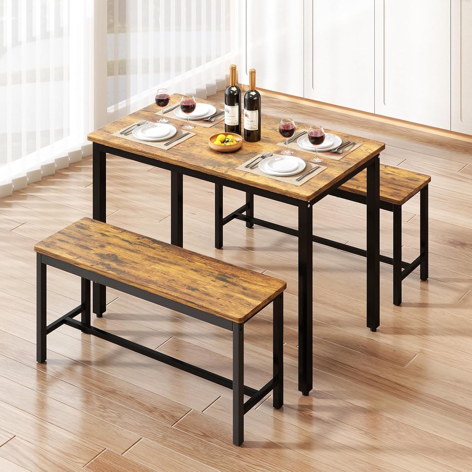 Rovibek Dining Table Set for 4 with 2 Benches – Space-Saving Kitchen Table Set for Kitchen & Dining Room, Brown