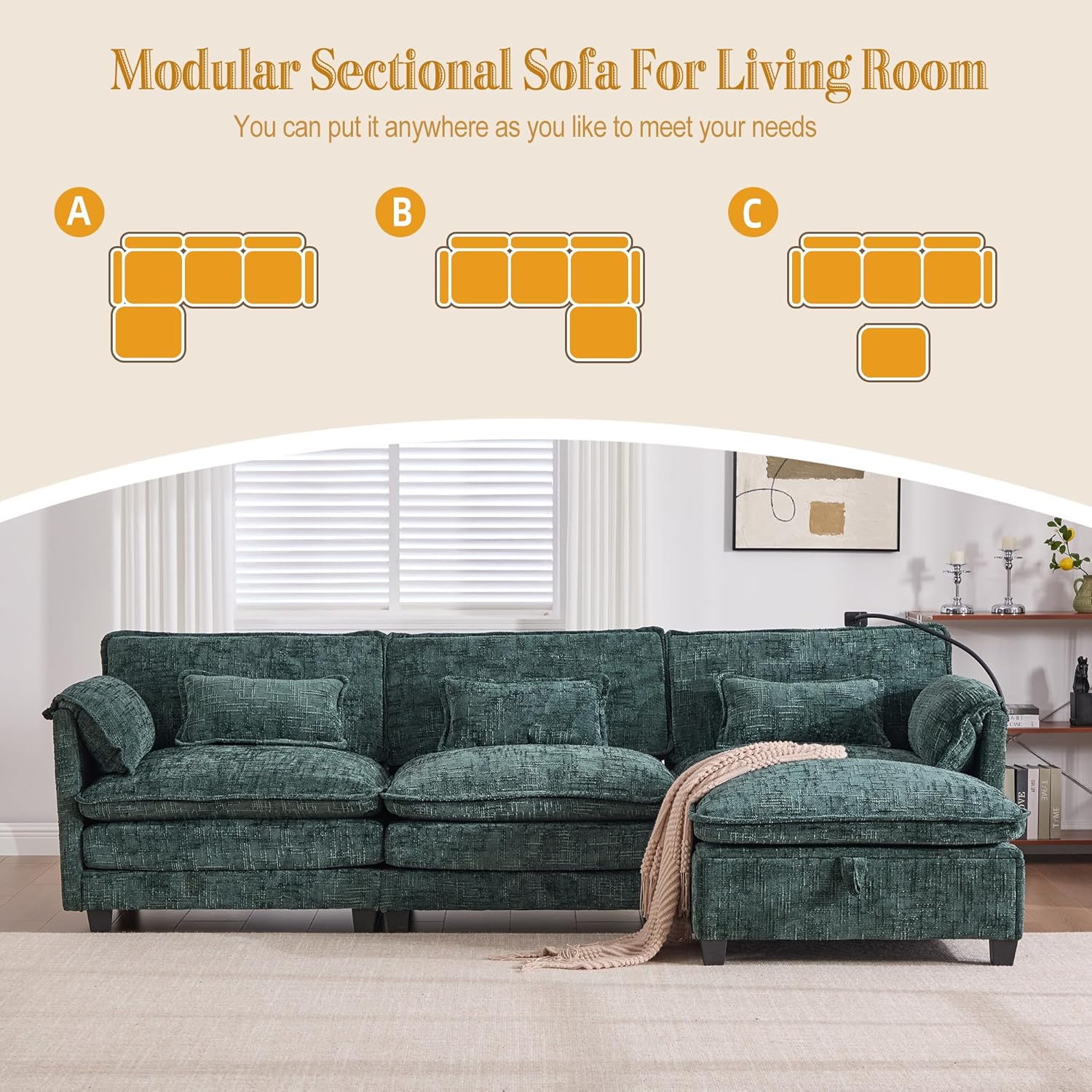 Ball & Cast Modular Sectional Sofa,Comfy Cloud Couch with Movable Storage Ottoman,L Shaped Sectional Sofa W/USB Charging Port,Phone Holder and Side Pocket,Chenille Fabric,for Living Room,Emerald,109"