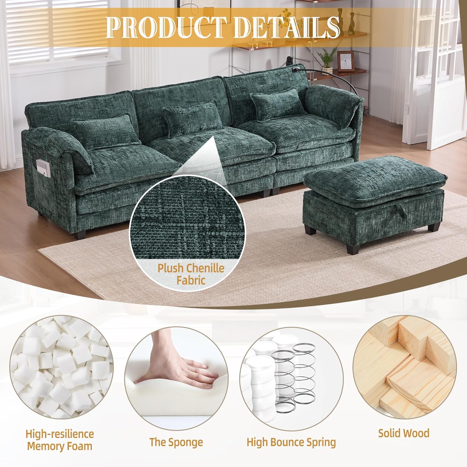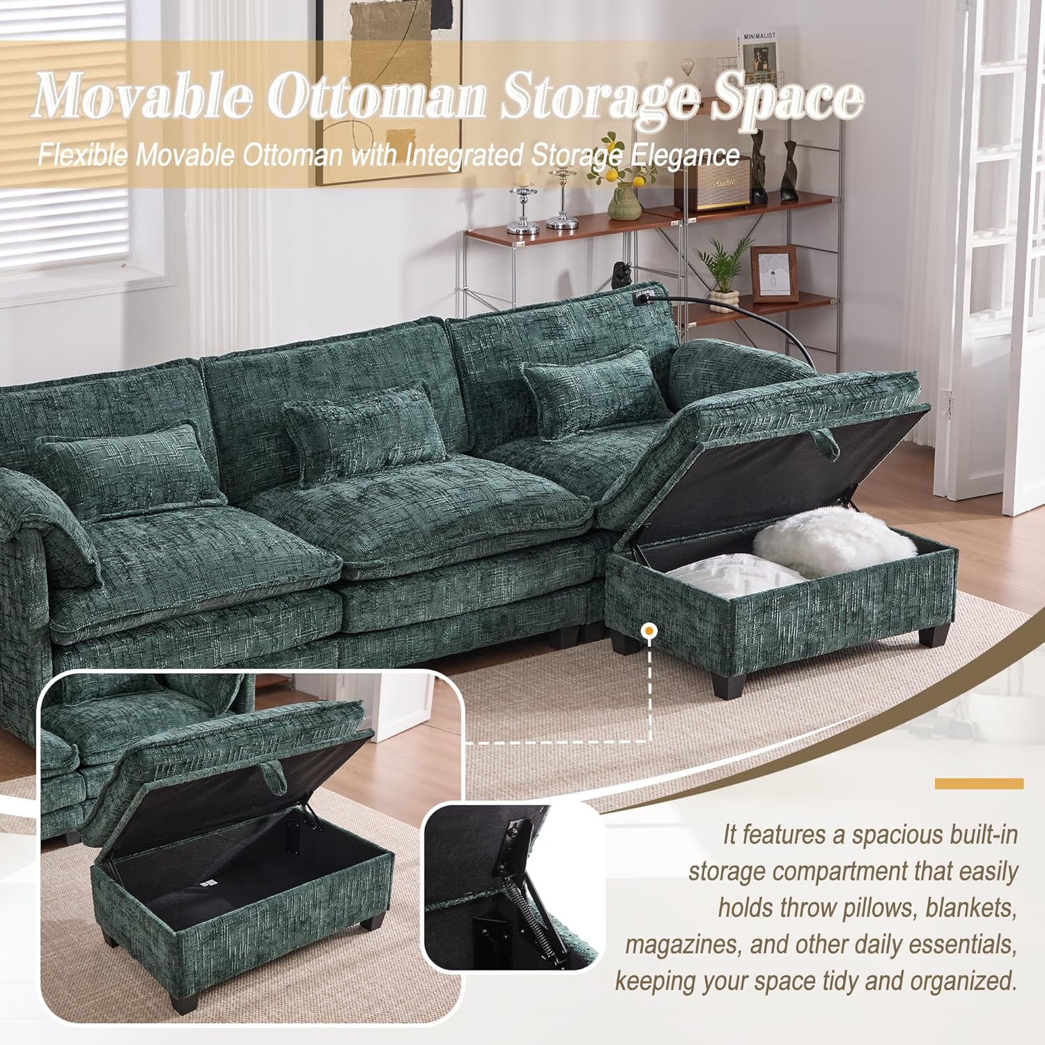 - Multifunctional Storage Ottoman: Maximize your space with the included ottoman. This clever piece doubles as hidden storage for blankets or remotes and instantly transforms into a footrest, extra seat, or extends your sectional couch. Keep your living room tidy and functional.