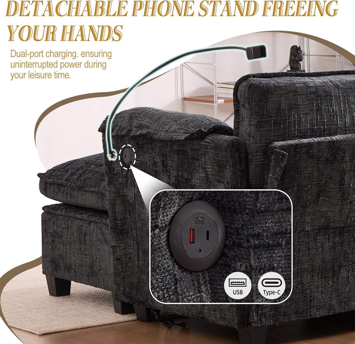 - Smart Charging Convenience: Stay powered up and organized. Integrated charging ports (1 USB + 1 Type-C) and a side phone holder keep your devices charged and within easy reach. This thoughtful feature makes your sectional sofa the smart, convenient centerpiece of your modern home.