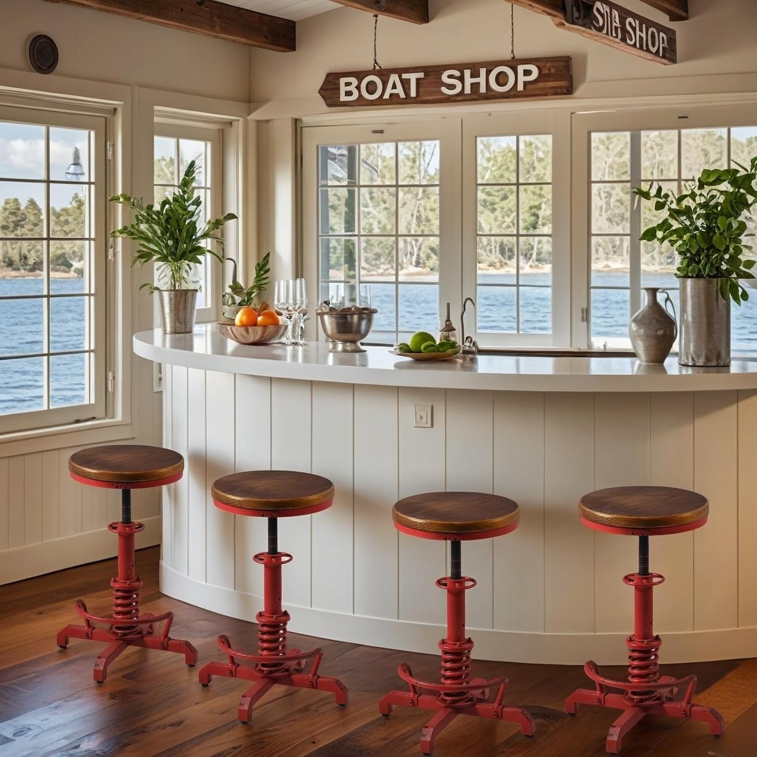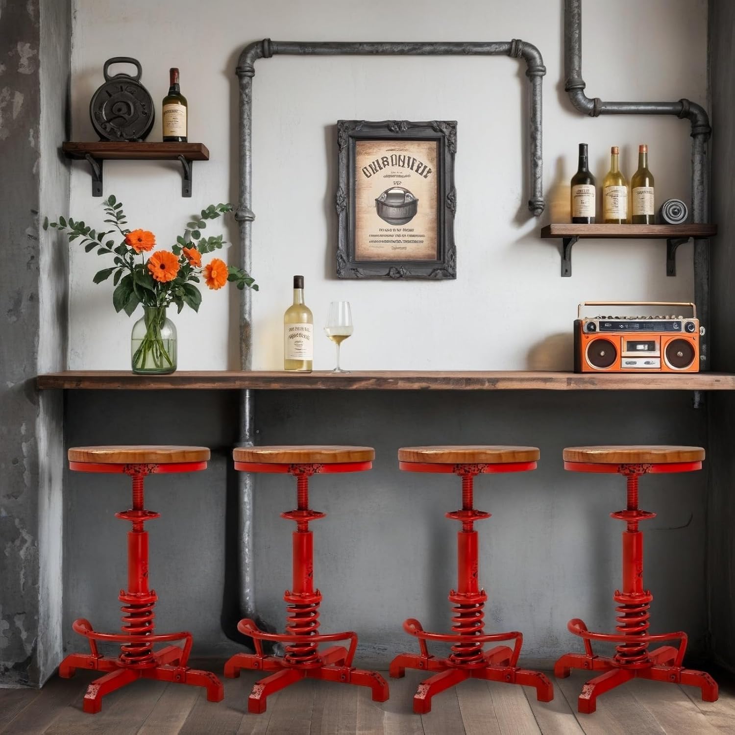4-Piece American Antique Steampunk Bar Stool 24.41"-28.35" Vintage Industrial Adjustable Swivel Backless Counter Stool for Home, Dining, Breakfast, Pub, (Heavy Duty Metal & Wood, Aged Red, Brown Top)