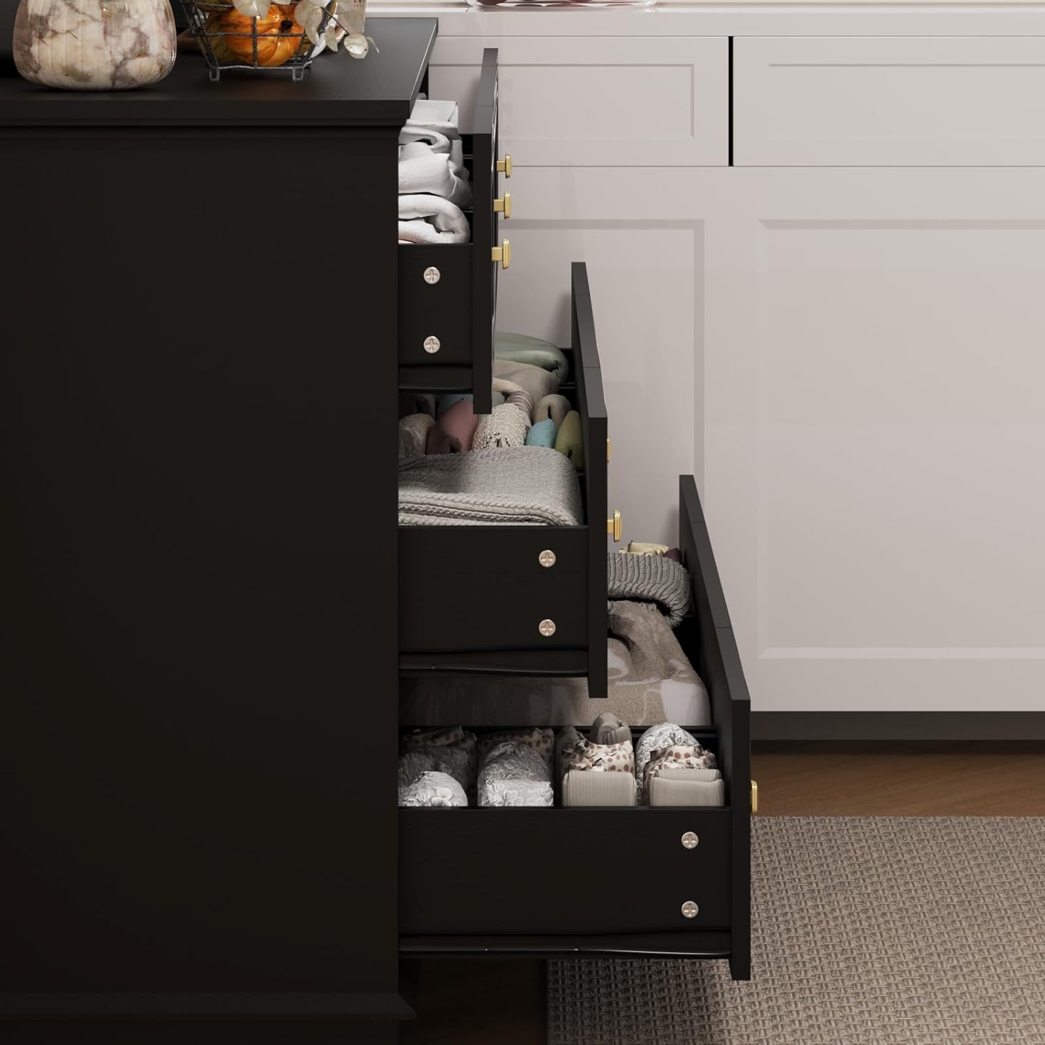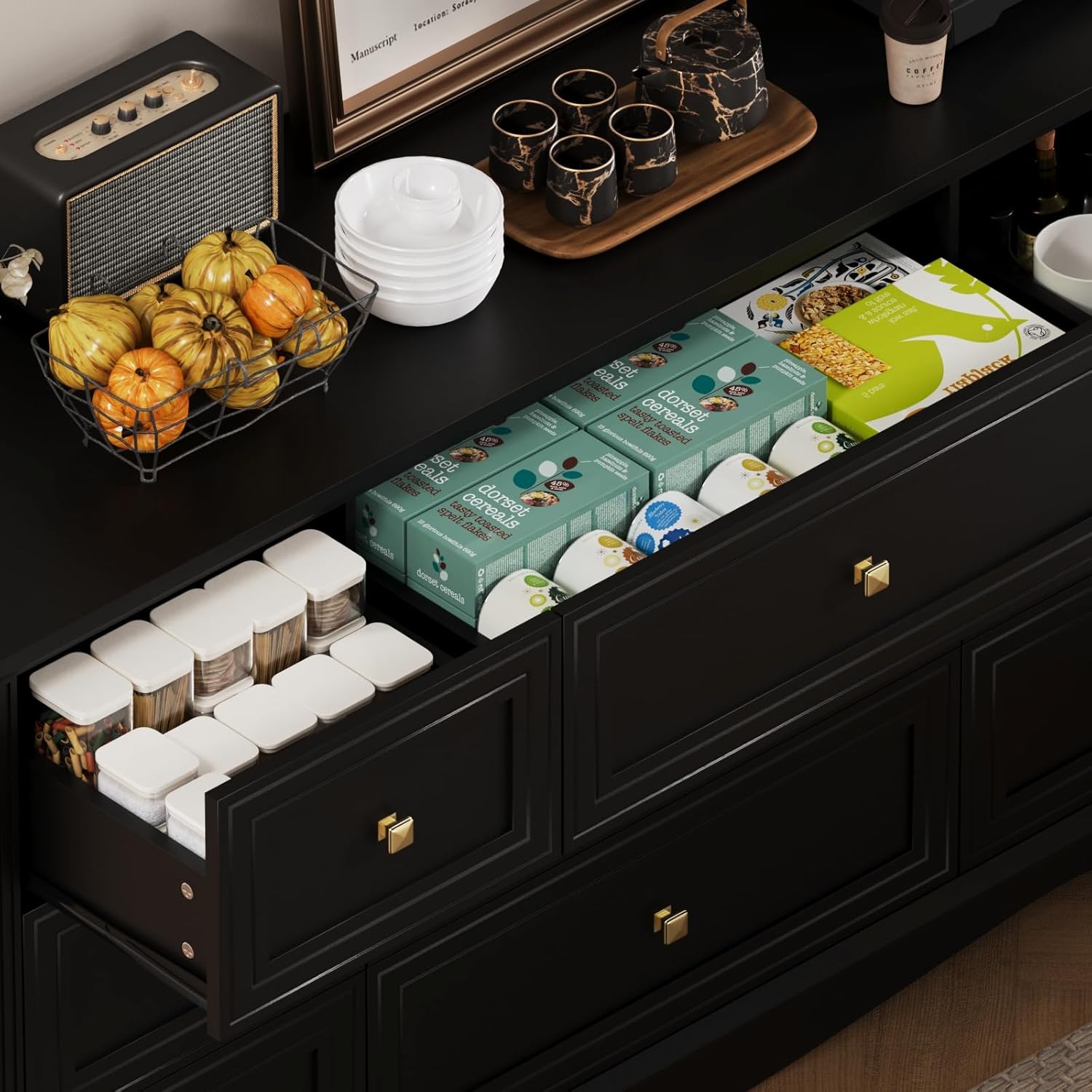 - 9 Drawer Storage – Cabinet features 3 larger center drawers for bulkier items, flanked by 3 smaller side drawers, offering tiered organization for kitchen tools, office supplies, or household essentials. The multi-size drawer design keeps everything neatly sorted and within easy reach, while the durable construction ensures long-lasting use as a kitchen organizer, craft storage, TV stand or bedroom dresser. Its space-saving design helps maintain a clutter-free home with stylish functionality.