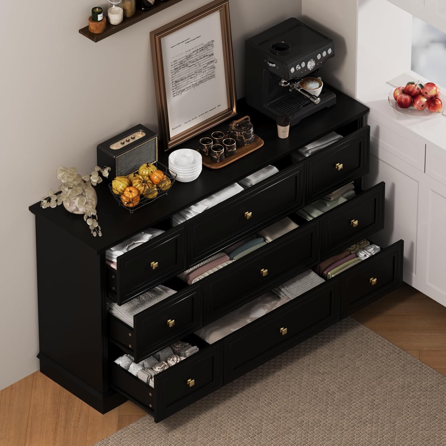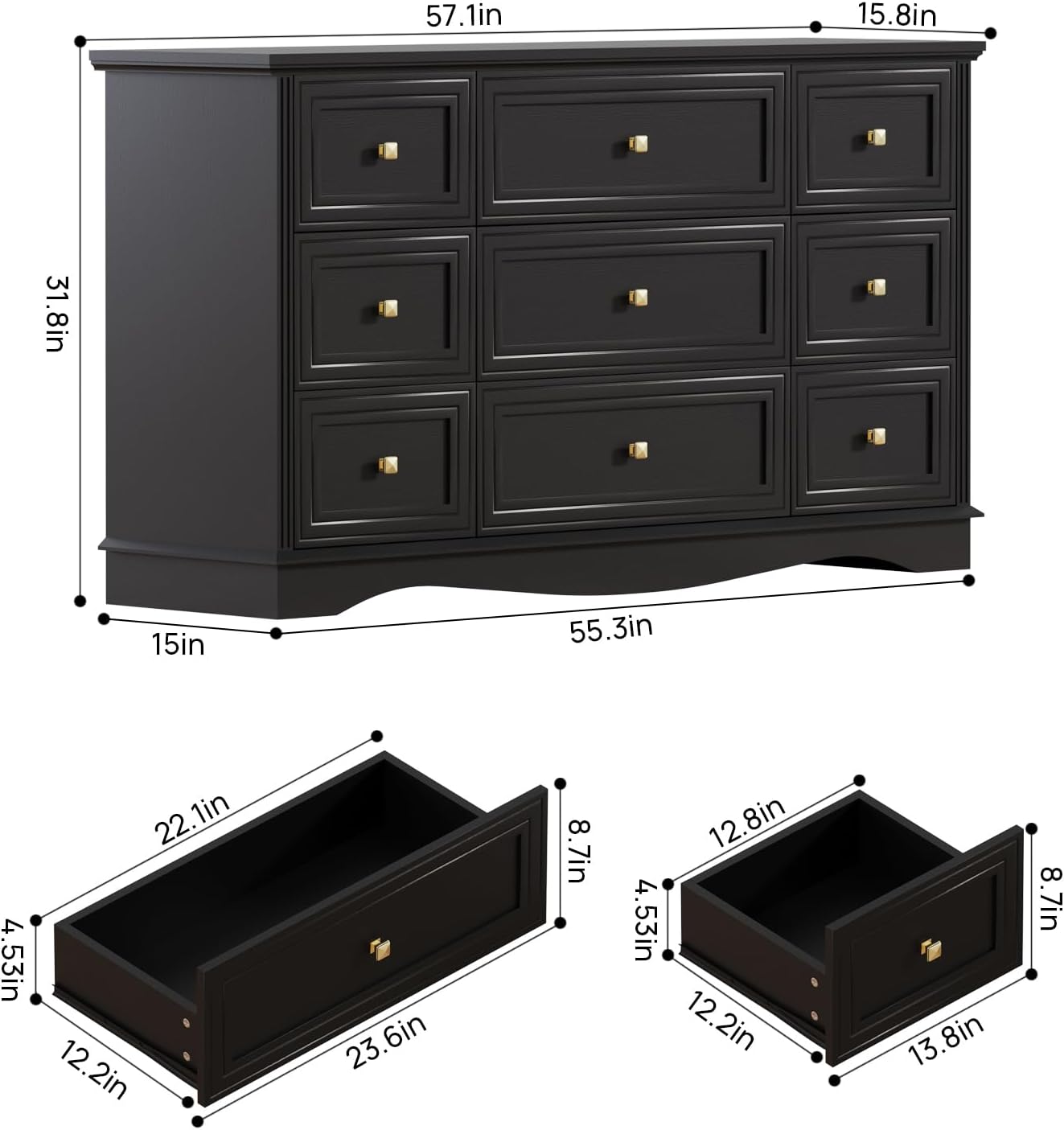 9-Drawer Dresser, 57" Wooden Chest of Drawers with Rustic Top, Modern Farmhouse Furniture Organizer, Bedroom Storage Cabinet for Clothes, Accessories, Living Room, or Entryway, Black
