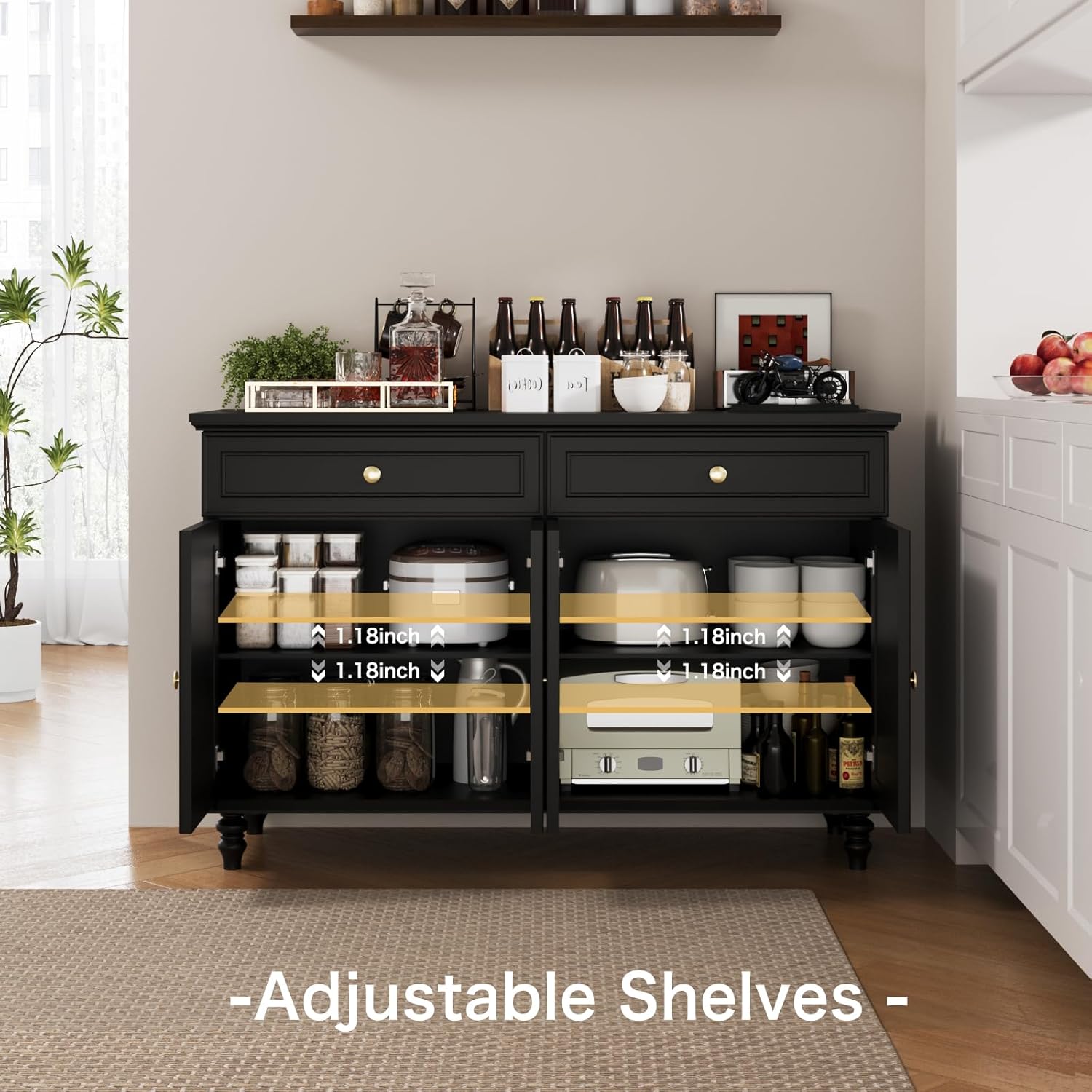 - Spacious & Versatile Storage – Kitchen buffet storage cabinet combines open and concealed storage to keep your kitchen or dining room neatly organized. The sturdy wood countertop supports small appliances like microwaves or coffee makers, while two spacious drawers provide quick access to utensils. Behind the four doors, adjustable shelves offer flexible space for dishes, glassware, or pantry items, ideal for maximizing storage in compact spaces.