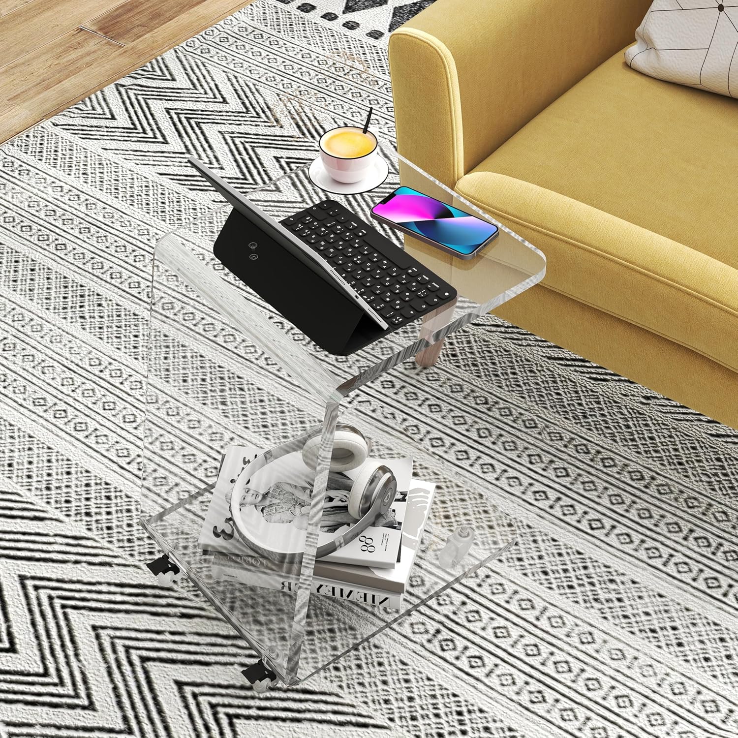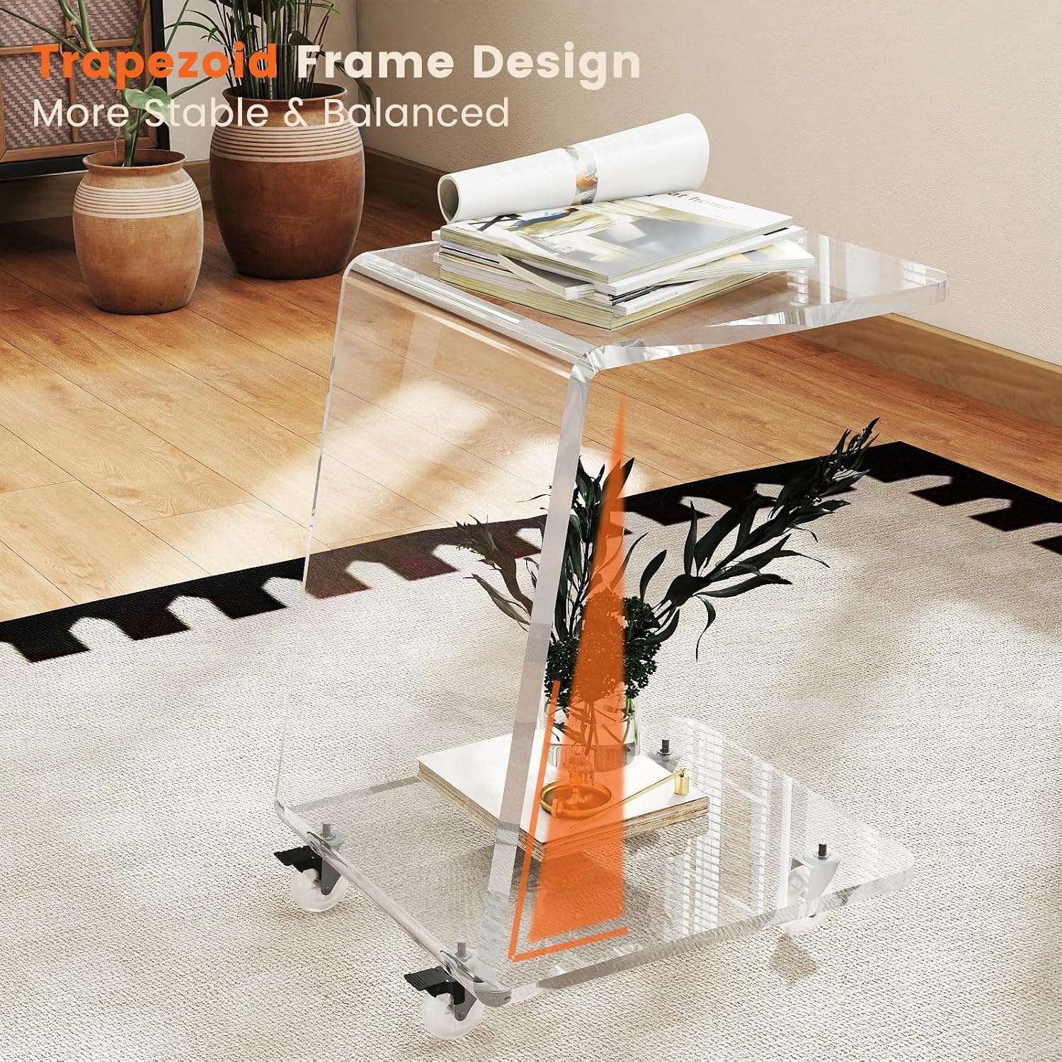 Modern Acrylic Side Table, Mobile C Shaped End Table for Sofa, Invisible Style Nightstand/Drink Tables/Snack Rolling Cart - Unique Stable Trapezoid Frame Design
