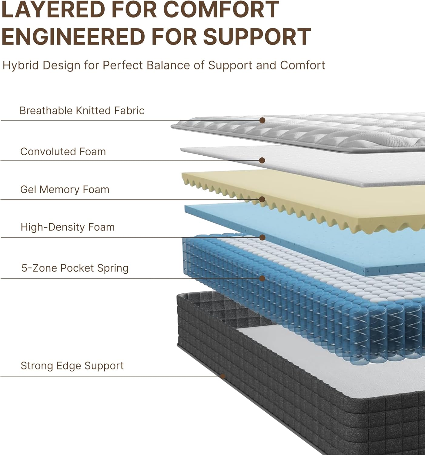 - Luxurious Comfort & Optimal Support for Deeper Sleep:Our Hybrid mattress combines individually pocketed springs with premium memory foam to evenly distribute weight and relieve pressure points. The smart design reduces body aches while conforming to your curves, and enhanced breathability keeps you cool for all-night comfort.