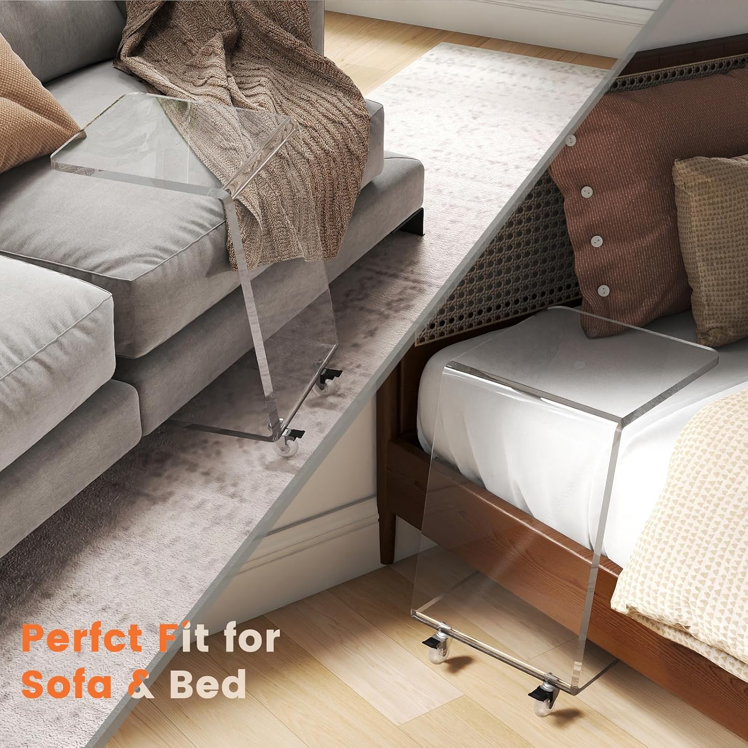2-Pack Clear Acrylic C Shaped Side Table with Wheels, Modern End Tables for Sofa, Couch, and Bed – 15mm Thick Durable Acrylic Small Snack Laptop Tables for Living Room & Bedroom
