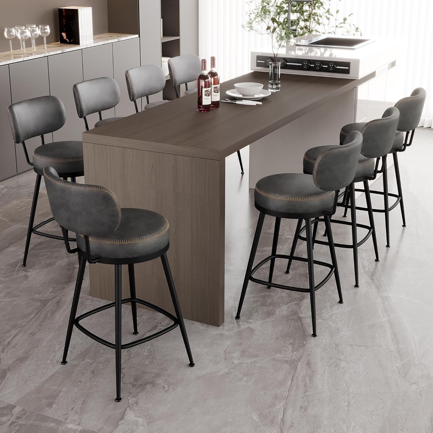 Counter Height Bar Stools, 26" H Swivel Barstools Set of 8, Faux Leather Kitchen Counter Stools with Back and Stylish Stitching, Metal Frame, Pub, Home Bar, Black Grey