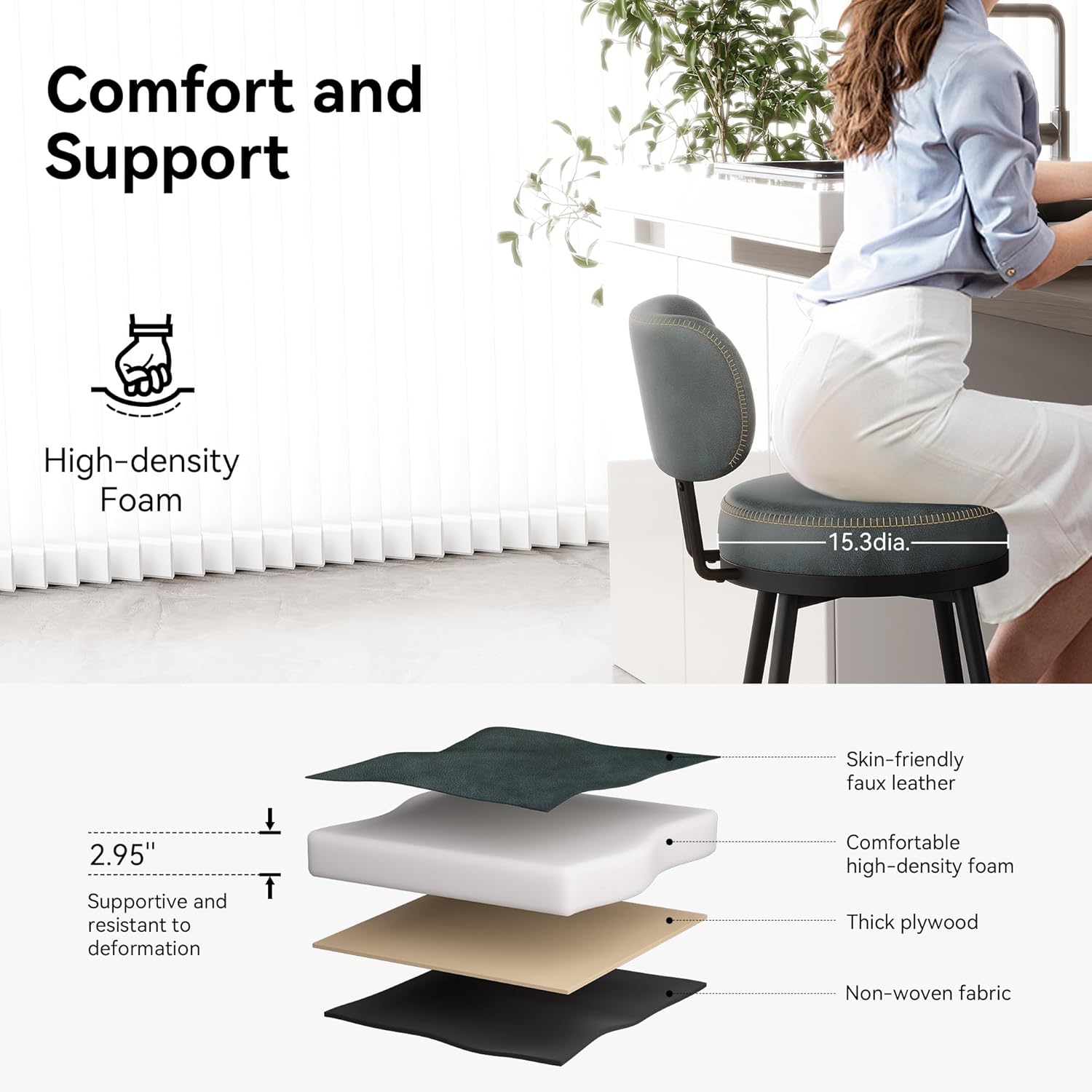 - Embracing Comfort at Every Sit - Glide your hand over the smooth luxury leather cover, then you sink into the soft and supportive stool seat of the thick (4") high-density foam, the wrap-around backrest provides plenty support for your back, creating a very soft and comfy long-time seating, and the footrest can be an extra support to relax your legs