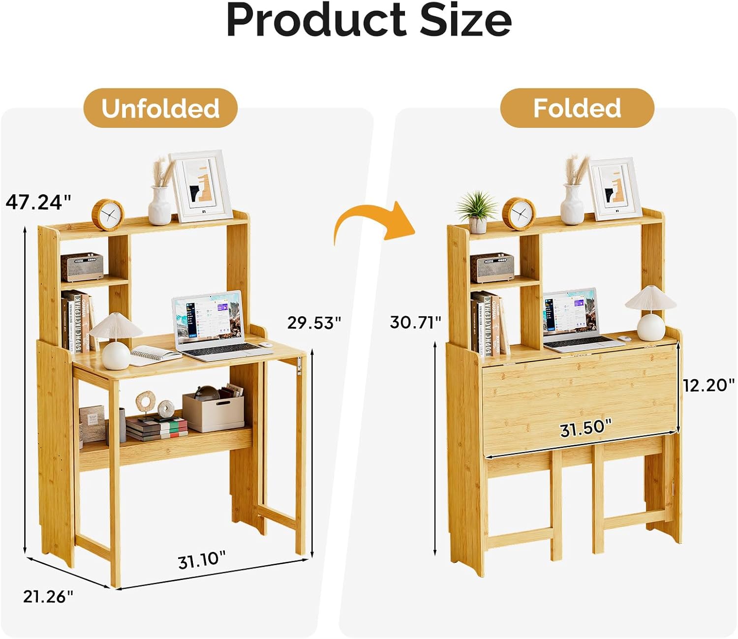 31.1" Bamboo Folding Desk with Bookshelf, Compact Computer Desk for Small Spaces, Foldable Study Desk with Storage Shelf, Space-Saving Home Office Desk for Bedroom, Dorm, Apartment,Natural