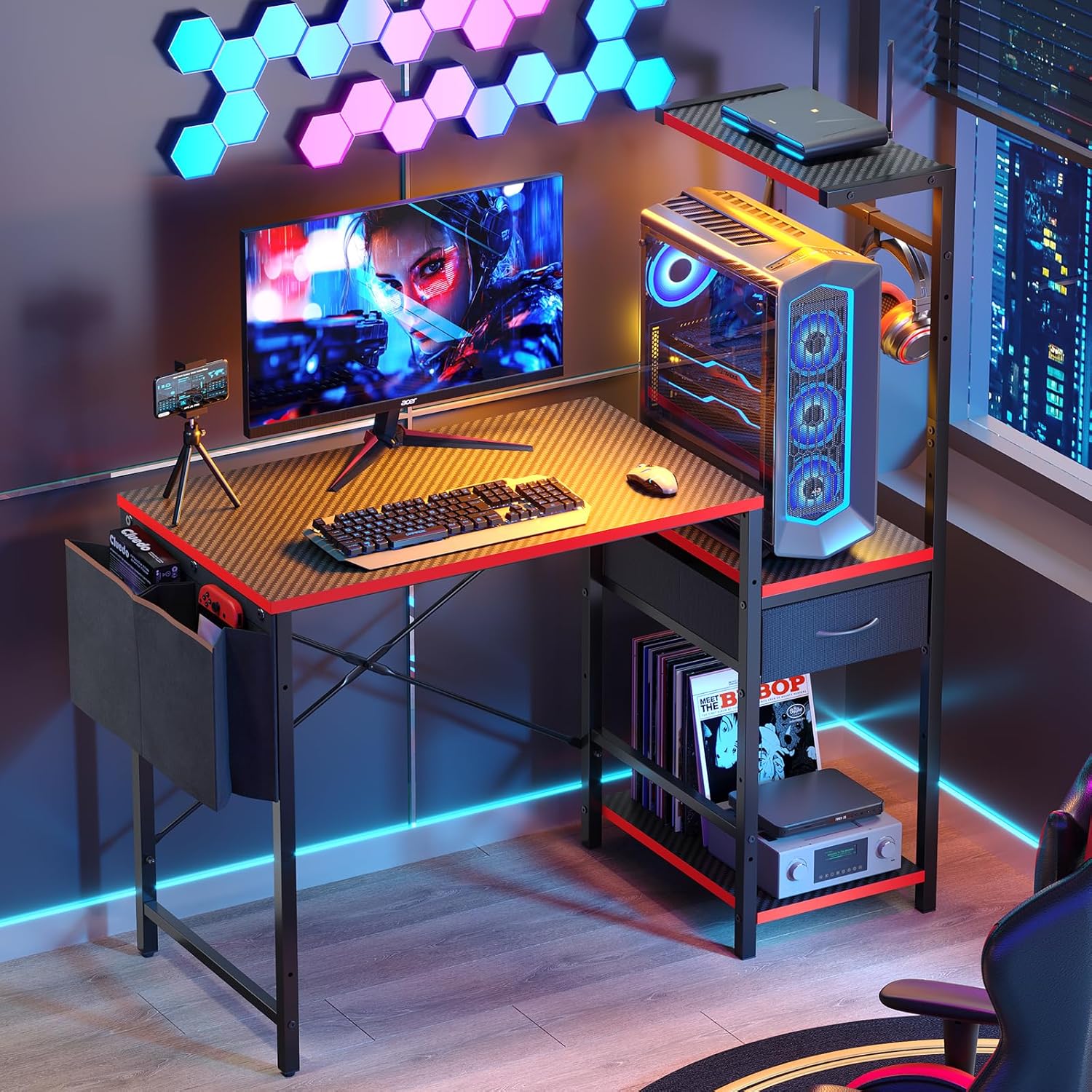 Bestier Gaming Desk with LED Lights, 44 Inch Reversible Computer Desk with Drawers & Storage Shelves for Small Spaces, PC Gamer Table with Storage Bag & Side Hook, Carbon Fiber Black-RED