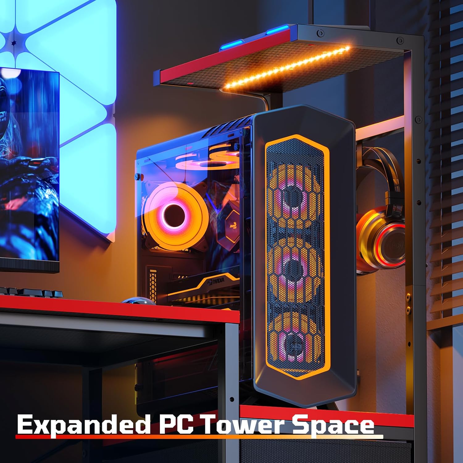 - 【Reversible PC Desk & Adjustable Shelf】The reversible shelf design allows you to mount the shelf on either the left or right side, depending on your setup and preference. The height-adjustable computer tower stand accommodates PC of various sizes, The side panel lighting matches your computer's RGB lighting for a immersive gaming experience.