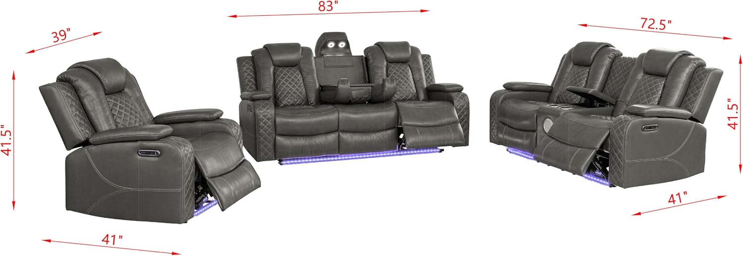 Ball & Cast Power Recliner Sofa Set Leather Reclining Sofa Set Living Room Furniture Set 3PCS Recliner Couch Loveseat & Chair Sets with Wireless Charging,Bluetooth Speaker,Cup Holders for Home Theater