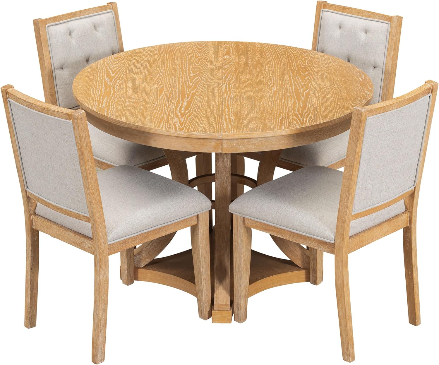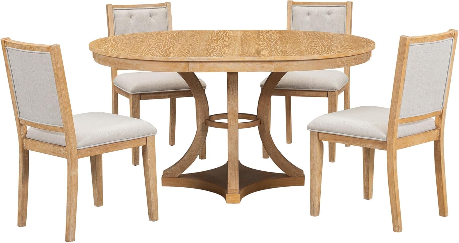 Merax 5-Piece Extendable Round Dining Table Set 42"-58" Retro Functional Table and 4 Upholstered Chairs for Dining Room and Living Room (Natural)