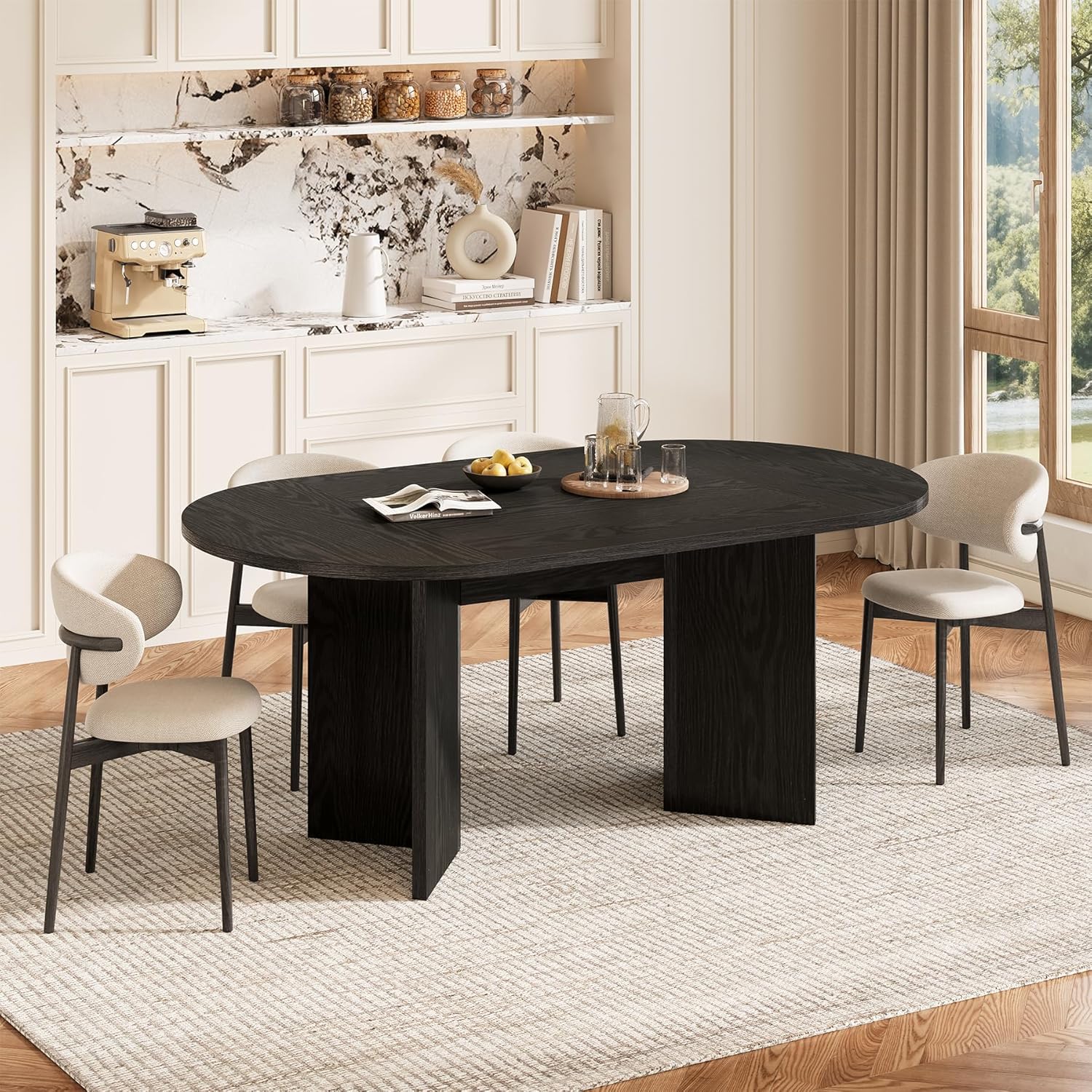 LITTLE TREE 63" Rustic Oval Dining Table for 4-6, Sturdy MDF Farmhouse Kitchen Table with Metal Strip Base, for Living Room, Office, Restaurant, Multi-Use, Black