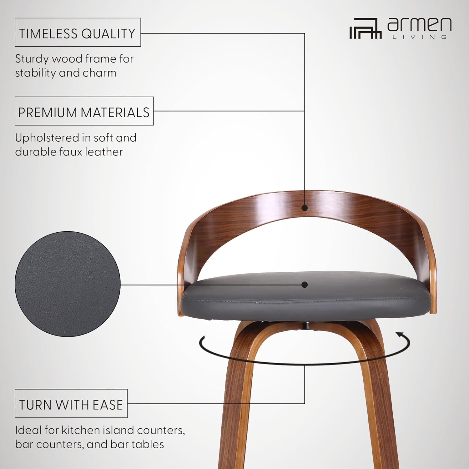 Armen Living Sonia 26" Counter Height Swivel Gray Faux Leather and Walnut Wood Bar Stool - Set of 2