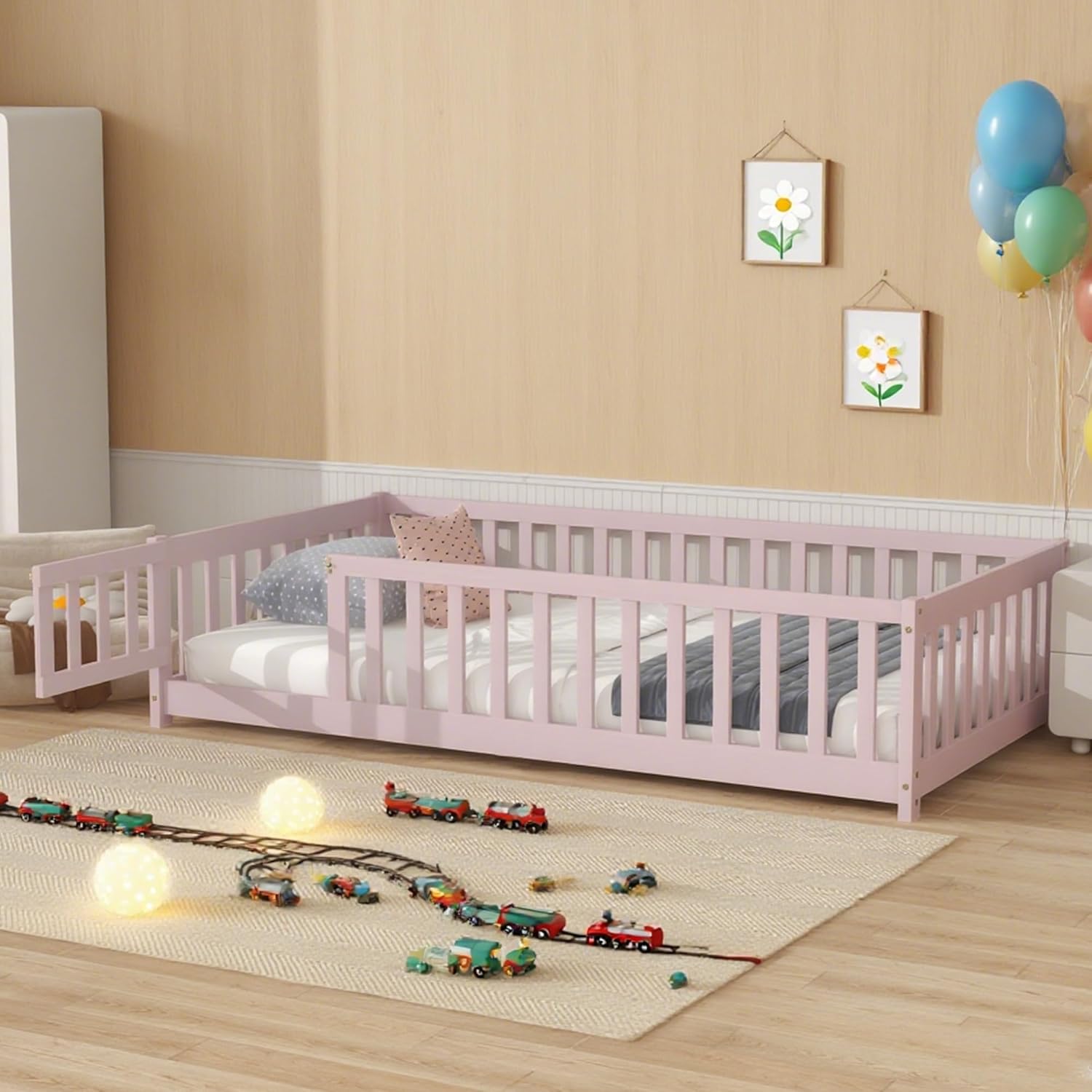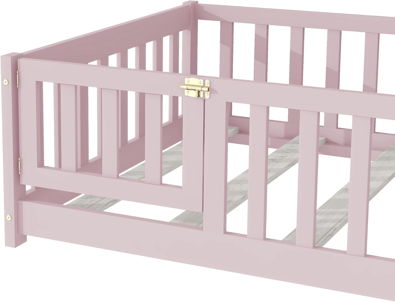 Twin Floor Bed Frame with Slats and Safety Guardrail, Wood Twin Size Montessori Floor Bed with Door and Fence, Easy Assemble Montessori Beds for Kids, Girls, Boys, Pink