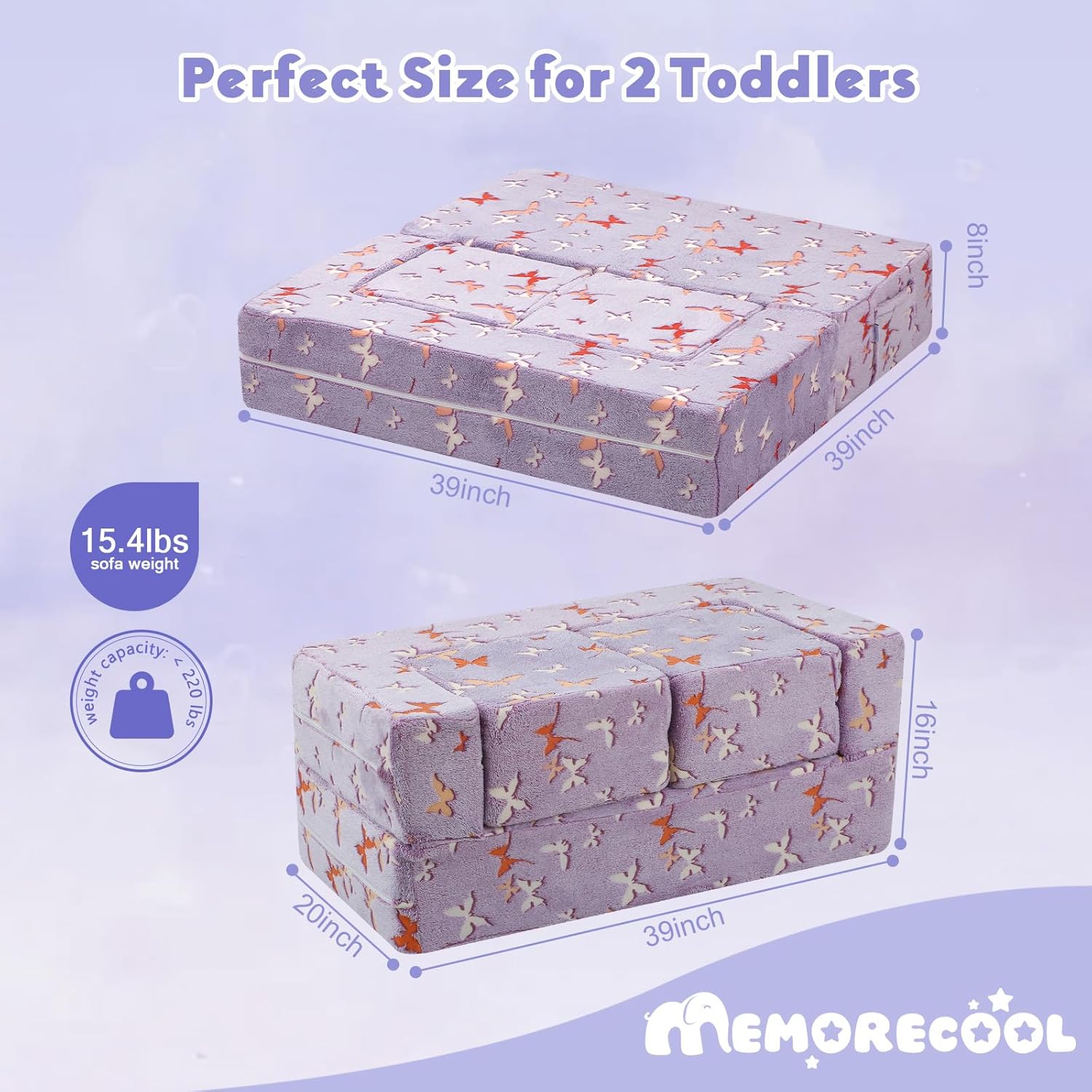 MeMoreCool Modular Kids Couch, Glow Play Toddler Couch for Bedroom Playroom, Convertible Foam Kids Sofa Bed, Fold Out Baby Sofa for Girl Boy, Butterfly
