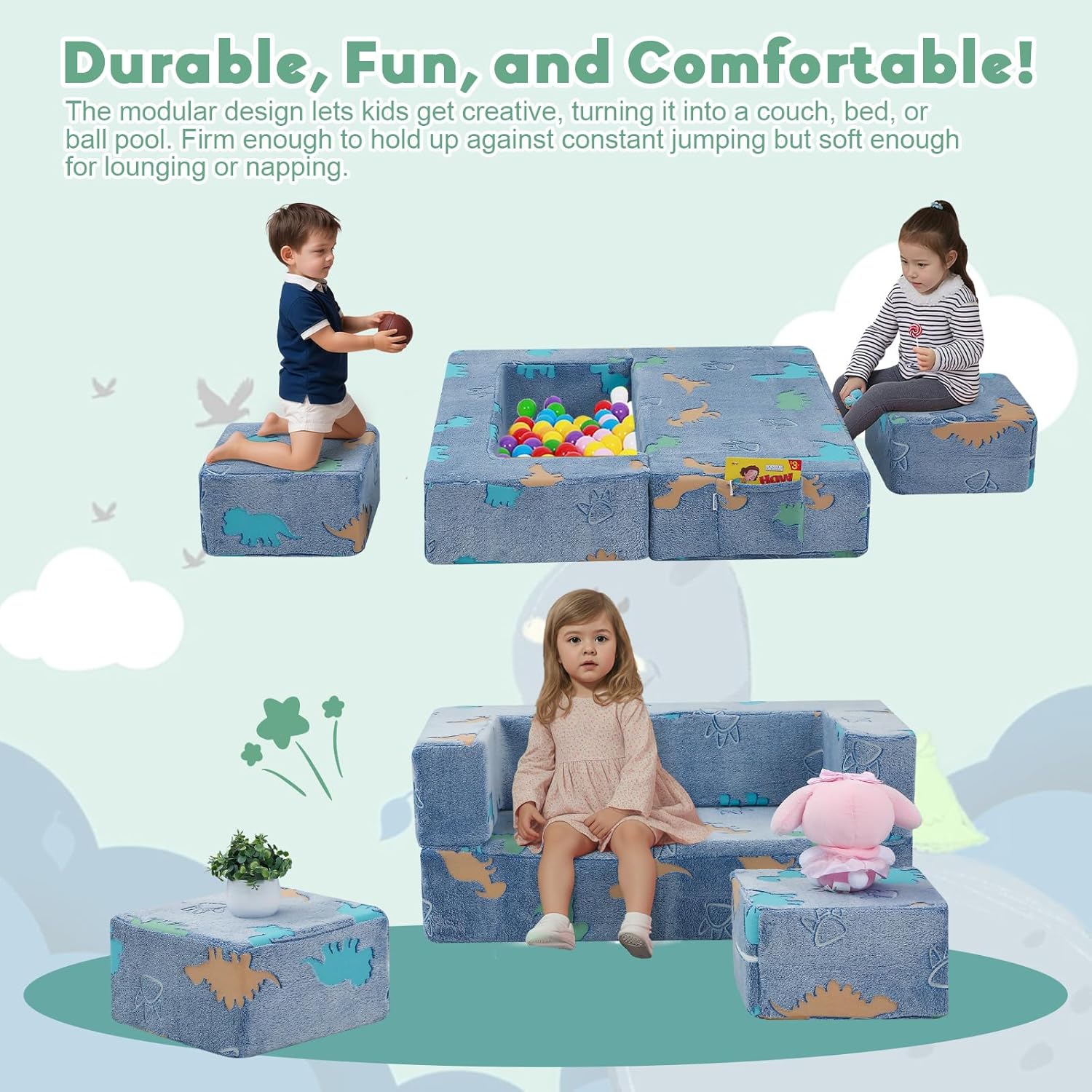 - Glow-in-the-Dark Modular Play Couch: This comfy kids’ couch transforms into a chair, table, bed, fort, obstacle course, ball pit, or hideout. Fully assembled and ready to use, it’s a versatile piece for your little ones to explore and enjoy