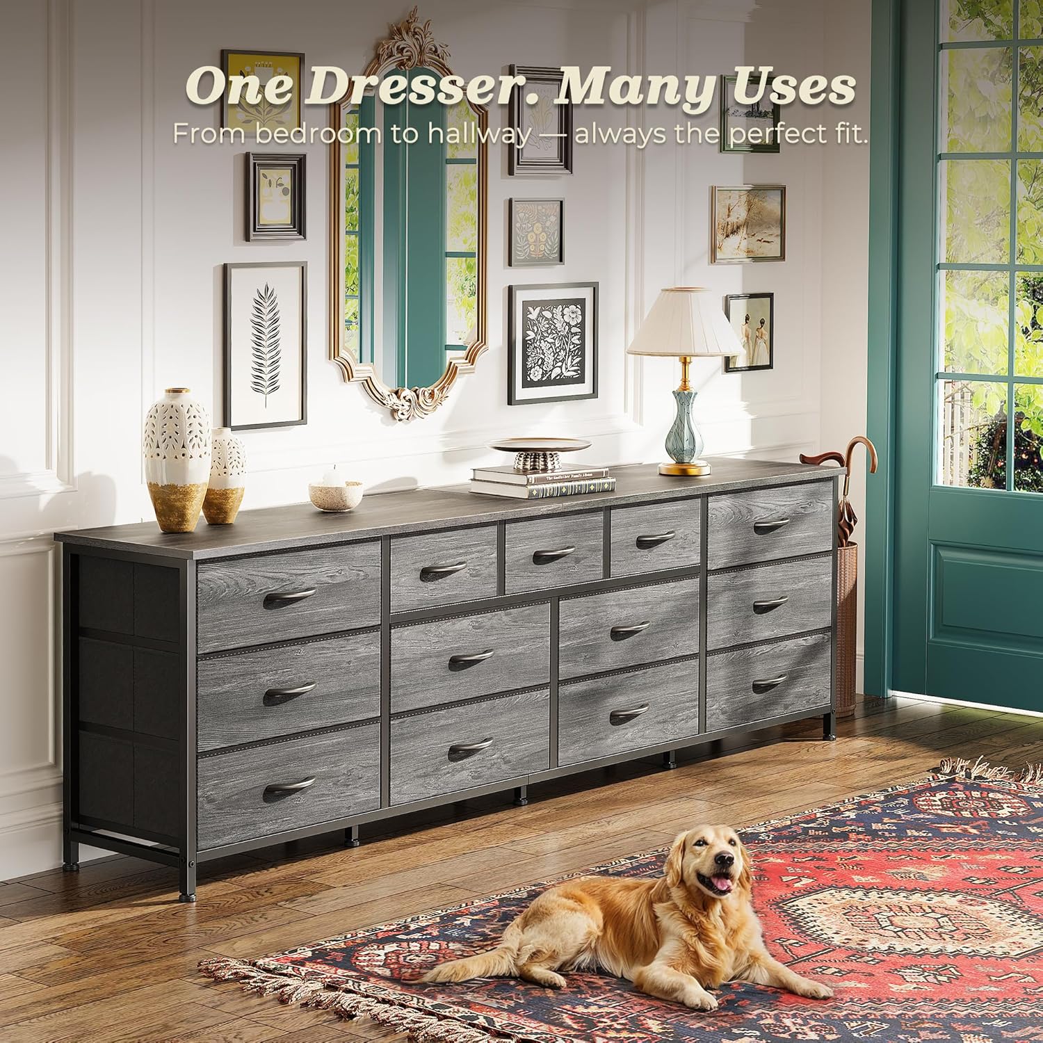 Huuger 70 Inch Dresser for Bedroom, TV Stand for 65, 75, 80 Inch TV, 13 Fabric Drawer Long Dresser, Large Entertainment Center for Bedroom, Wide Chest of Drawer with Storage, Grey