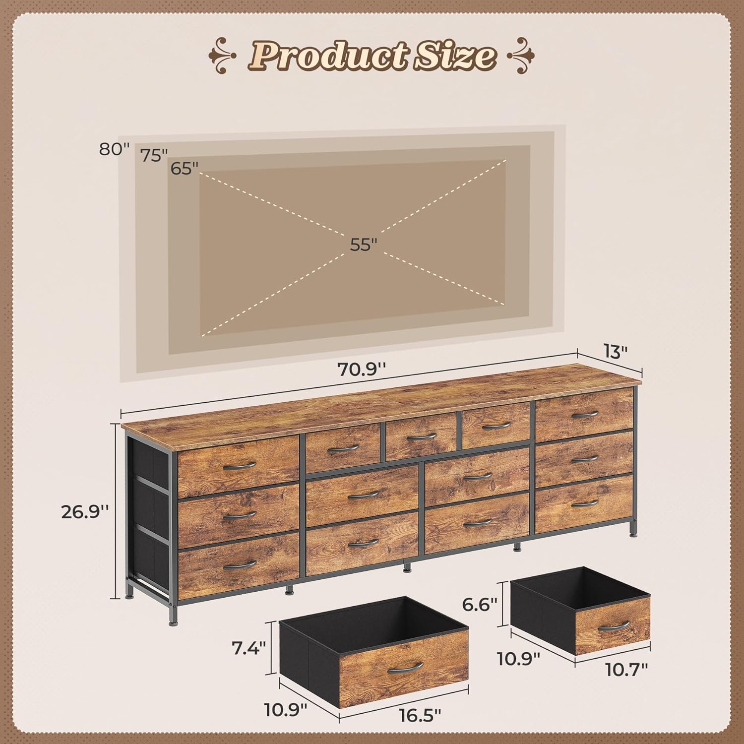 Huuger 70 Inch Dresser for Bedroom, TV Stand for 65, 75, 80 Inch TV, 13 Fabric Drawer Long Dresser, Large Entertainment Center for Bedroom, Wide Chest of Drawer with Storage, Rustic Brown