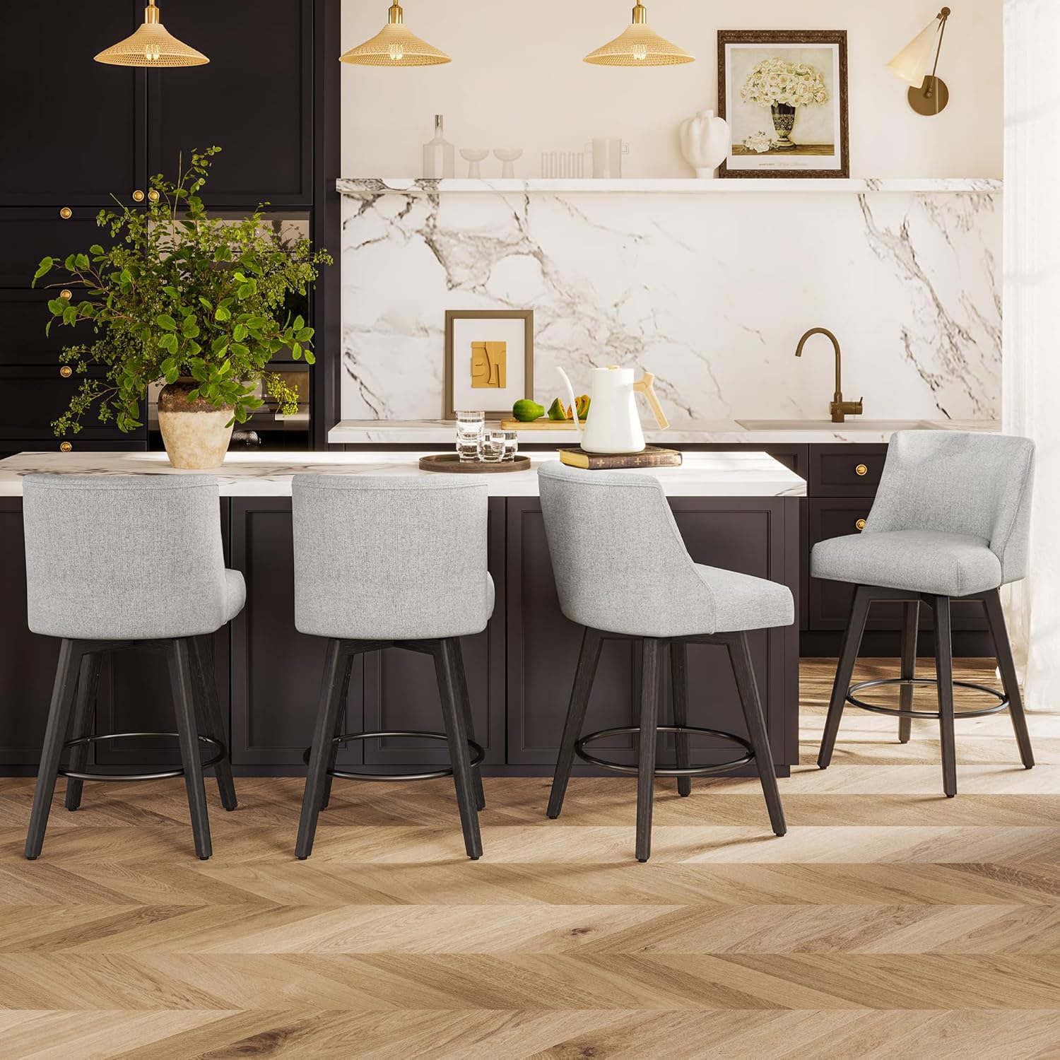 Counter Height Bar Stools Set of 4, Modern Swivel Barstools with Back and Wood Legs, Linen Fabric Upholstered Bar Chairs, 26" H Kitchen Counter Stools, Kitchen Island Home Bar, Light Grey