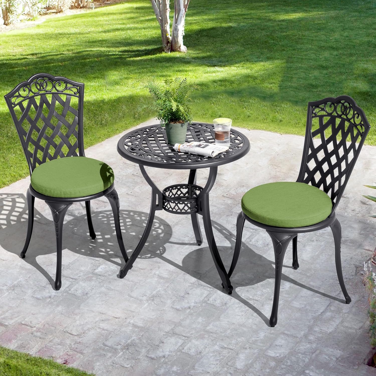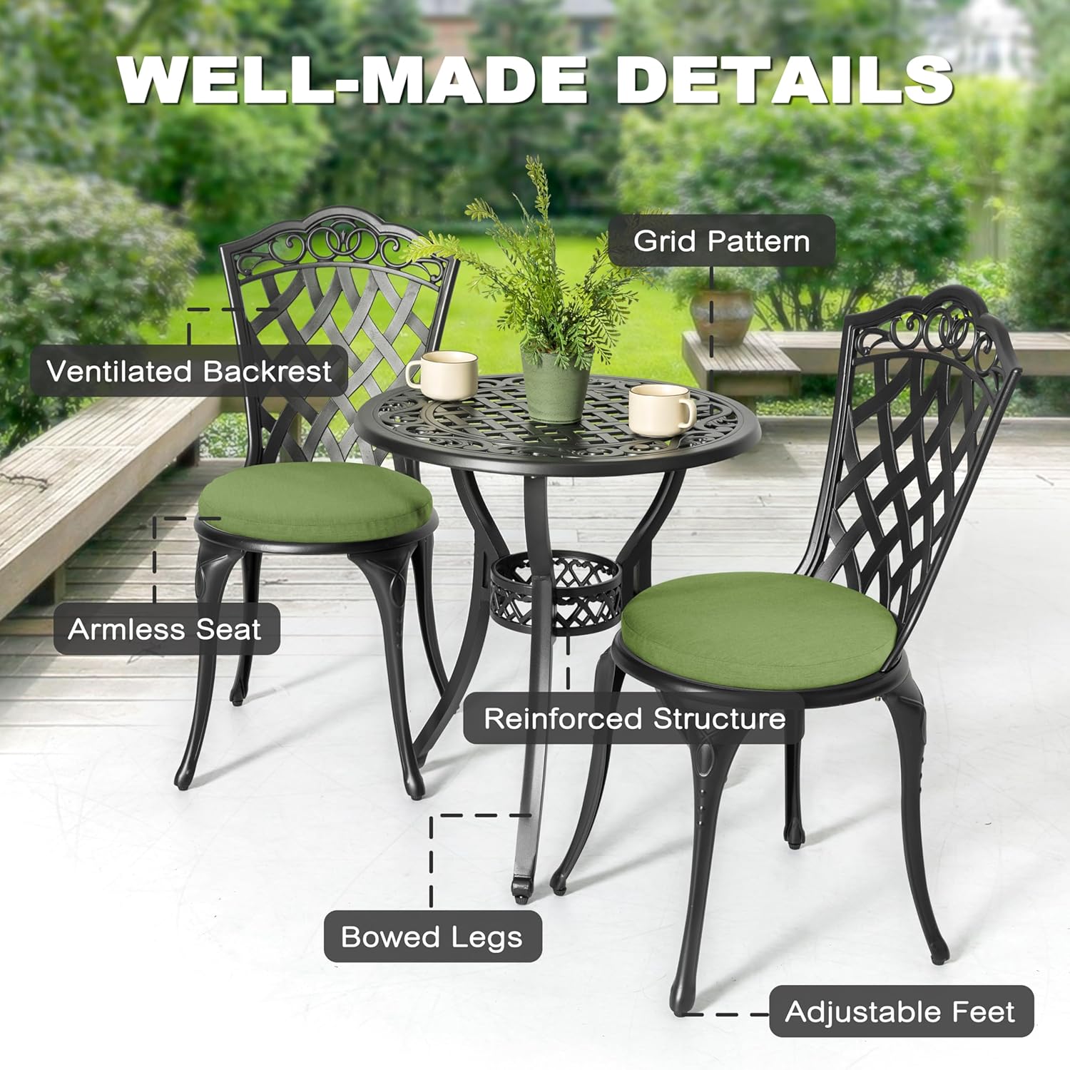 NUU GARDEN 3-Piece Patio Bistro Set Outdoor Cast Aluminum Bistro Table and Chairs Set of 2, Outdoor Patio Bistro Set with Umbrella Hole and Green Cushions for Patio Balcony, Black