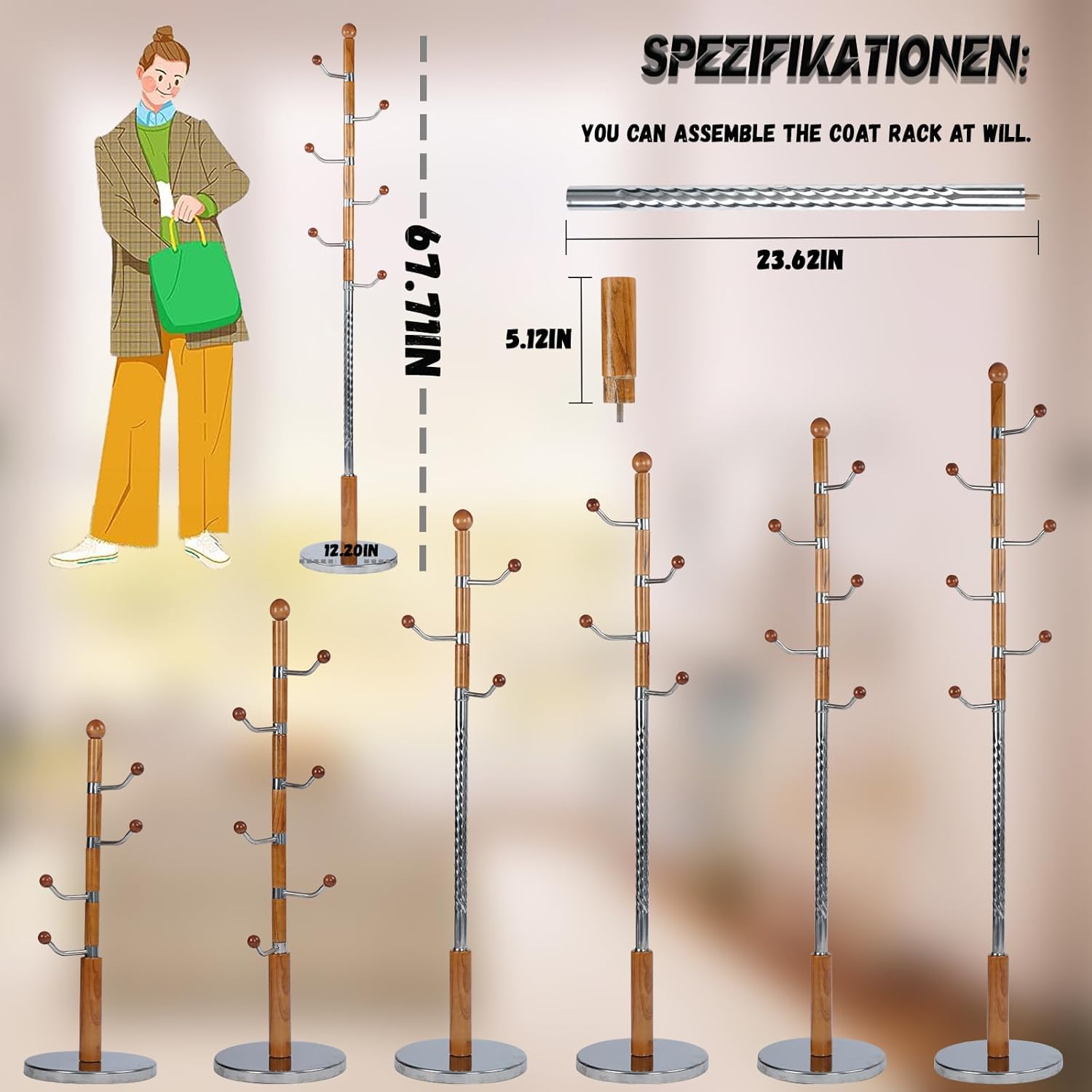 68 in Wood Coat Rack, Coat Rack Freestanding with Stable Round Base, Adjustable Height Tree Coat Racks Stand for Home Bedroom Office Hallway Entryway (Solid Wood Metal Hook)