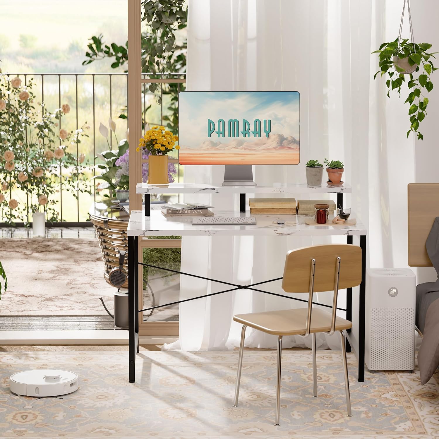 Pamray 32 Inch Small Computer Desk with Monitor Stand, Simple Office Desk with Headphone Hook for Small Spaces, Kids Study Writing Table for Bedroom, Marble