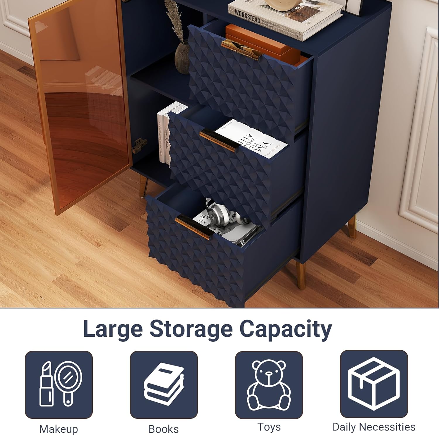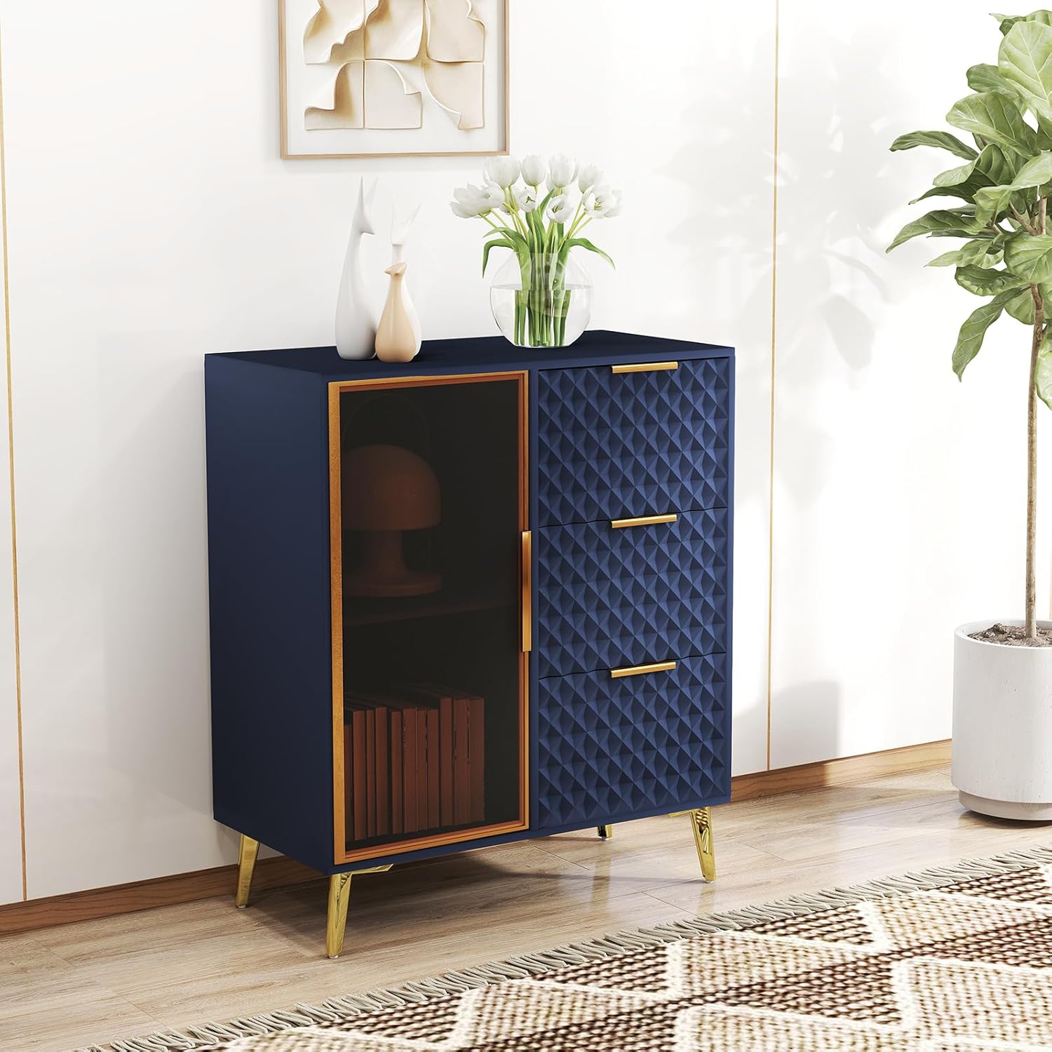Rovibek Modern Sideboard Cabinet with Storage, Small Kitchen Buffet Cabinet with Glass Door & 3 Drawers, 31" Accent Sideboard Buffet for Kitchen, Living Room, Blue