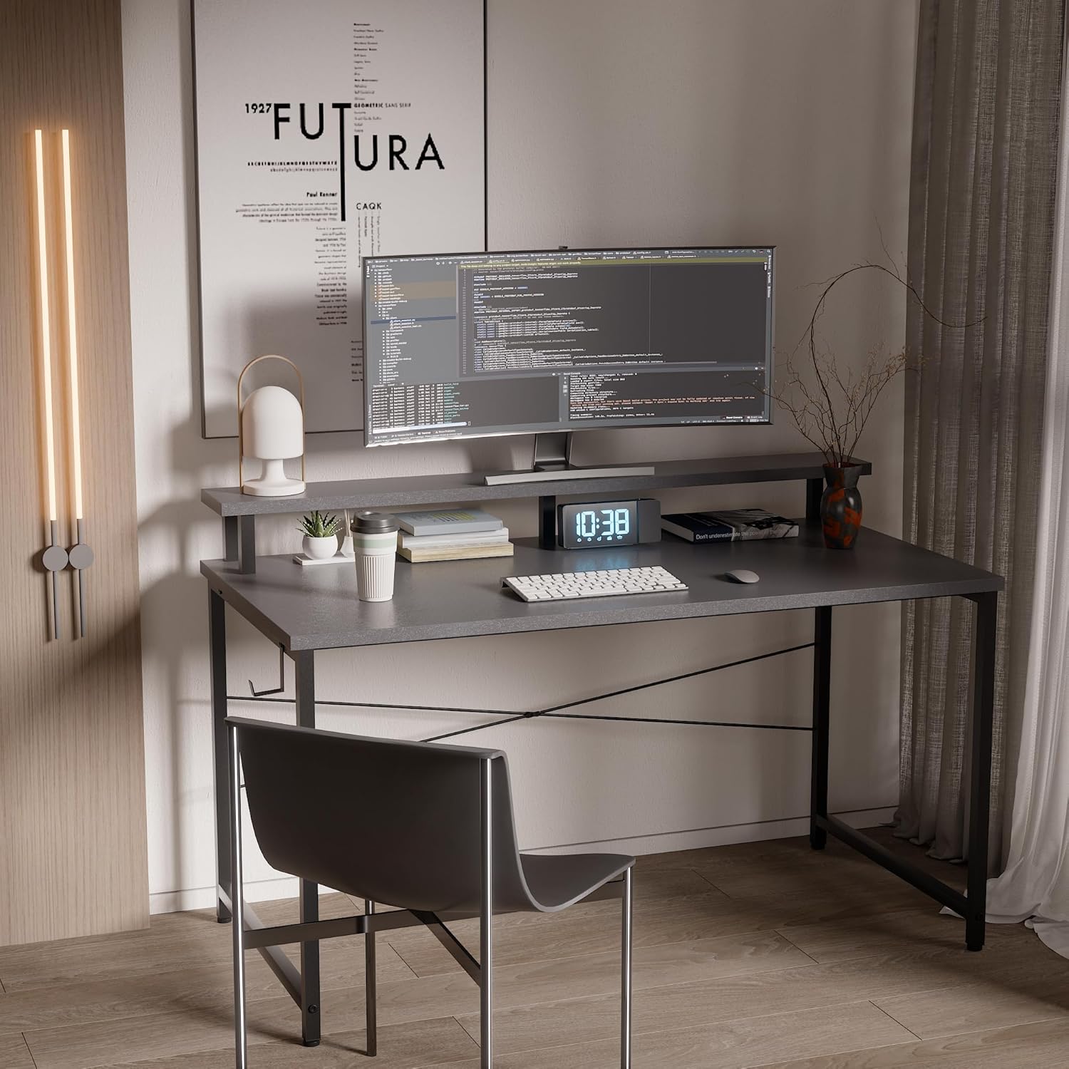 Pamray 47 Inch Small Computer Desk with Monitor Stand, Simple Office Desk with Headphone Hook for Small Spaces, Kids Study Writing Table for Bedroom, Grey