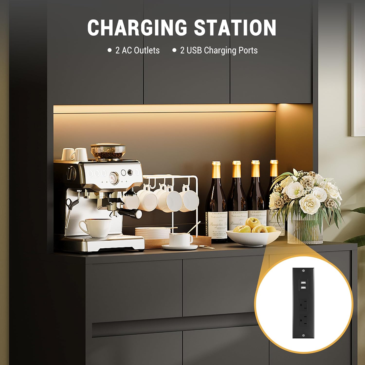 - Versatile Charging Hub & Microwave Stand:Keep your countertops clutter-free with our kitchen pantry storage cabinet with microwave stand, featuring a built-in charging station (2 AC outlets + 2 USB ports). Whether you're powering small appliances like coffee makers or charging devices while cooking, everything stays organized and within reach. The sturdy top shelf is ideal for microwaves, while the compact footprint makes it a perfect small kitchen pantry storage cabinet for apartments.