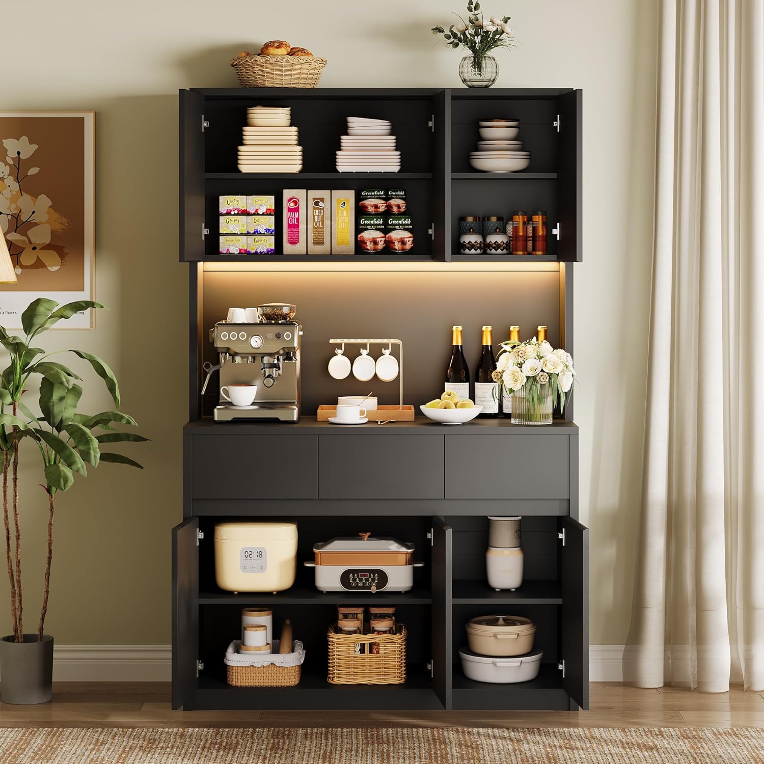 Garvee Kitchen Pantry Storage Cabinet, Tall Storage Cabinet with Doors and Shelves, Kitchen Storage Hutch with Microwave Stand, Led Lights and Charging Station,Corner Pantry Cabinet,Black