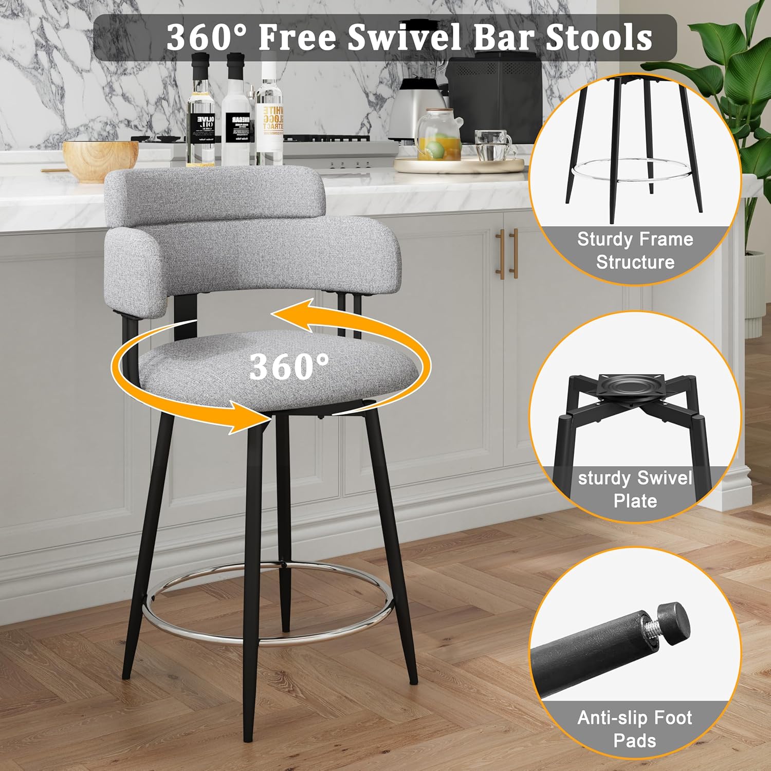 - Swivel & Comfort: This counter bar stool features a plush, full-back cushion and 360-degree swivel for all-day comfort. Equipped with floor protectors, it shields hardwood and tile floors from scratches and slips, making it a perfect addition to any kitchen or bar area.