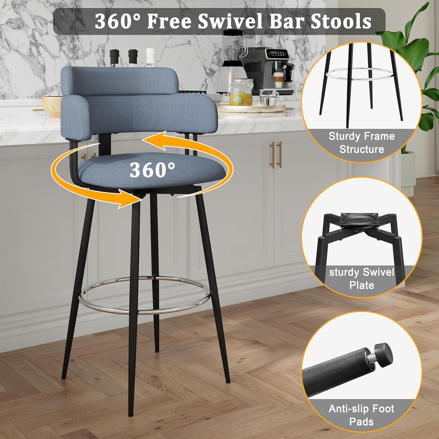 - Swivel & Comfort: This counter bar stool features a plush, full-back cushion and 360-degree swivel for all-day comfort. Equipped with floor protectors, it shields hardwood and tile floors from scratches and slips, making it a perfect addition to any kitchen or bar area.