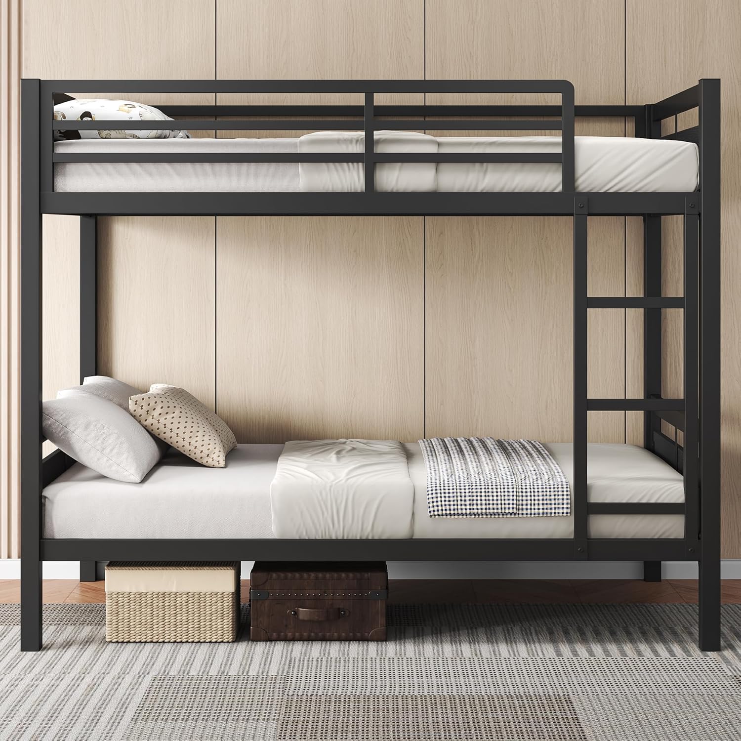 Feonase Metal Twin Over Twin Bunk Bed with Ladder and High Guardrail, Heavy-Duty Metal Slats Support, Noise Free, No Box Spring Needed, for Kids and Juniors, Black