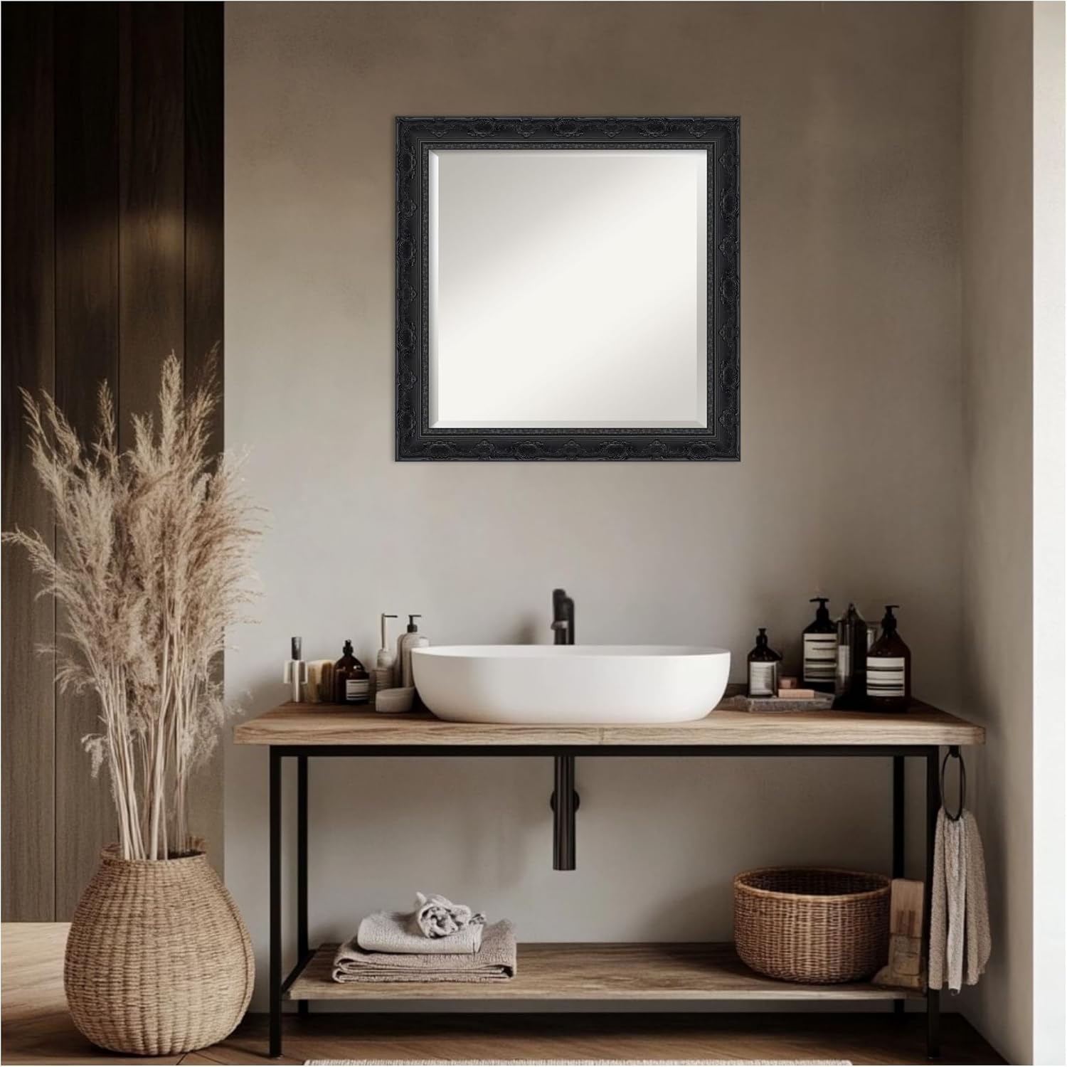 Amanti Art Bathroom Mirror for Over Sink, 25x25 Filigree Gloss Black Square Vanity Mirror, Medium Traditional Frame, Hangs Horizonally and Vertically, Bathroom Wall Decor, Beveled Edge