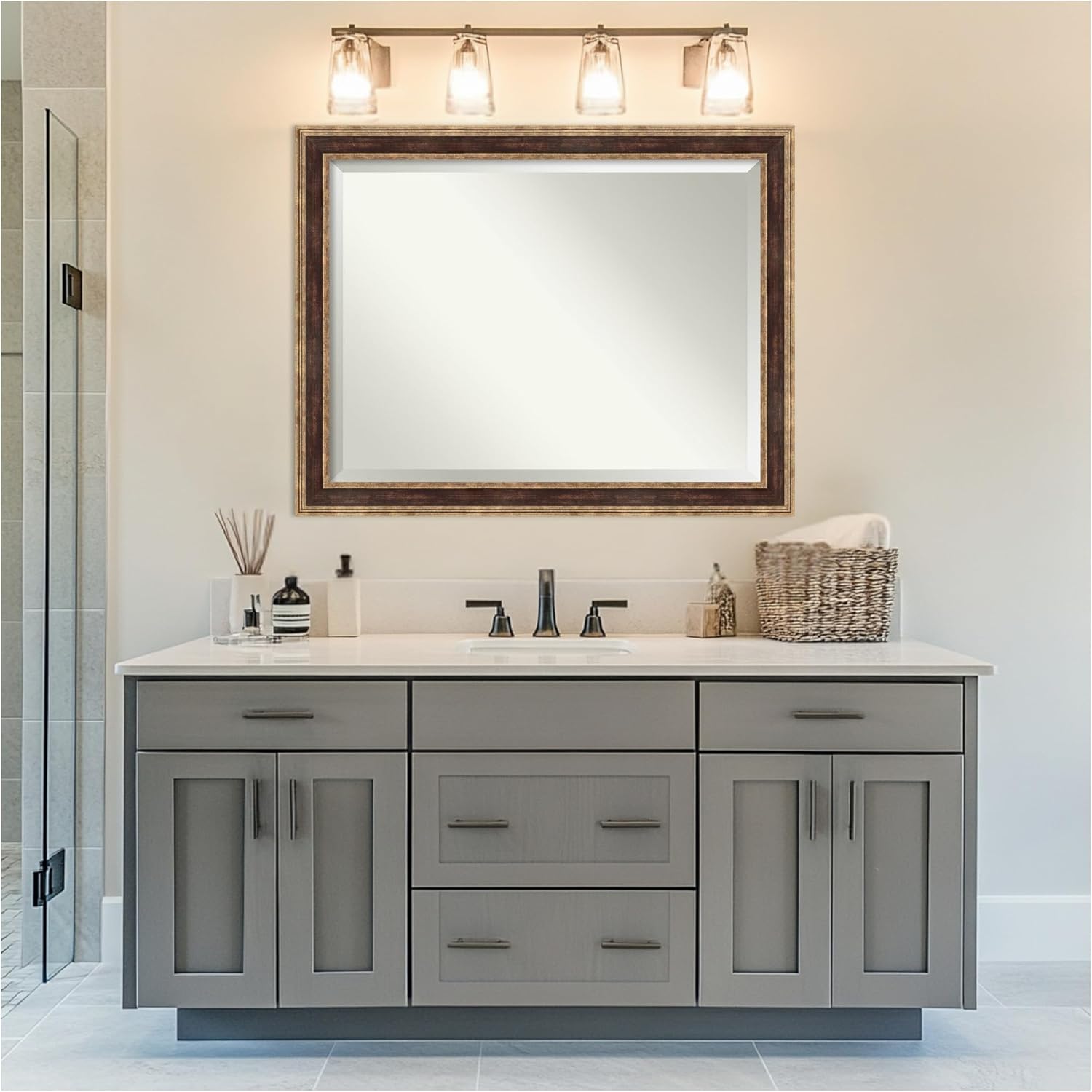 - MIRROR DETAILS: This mirror features premium glass for a clear, undistorted image and is finished with a beveled edge to give the glass a decorative touch. The overall size of this bathroom mirror measures exactly 46 x 36 inches, including the frame. Its reflective area measures 40 x 30 inches.