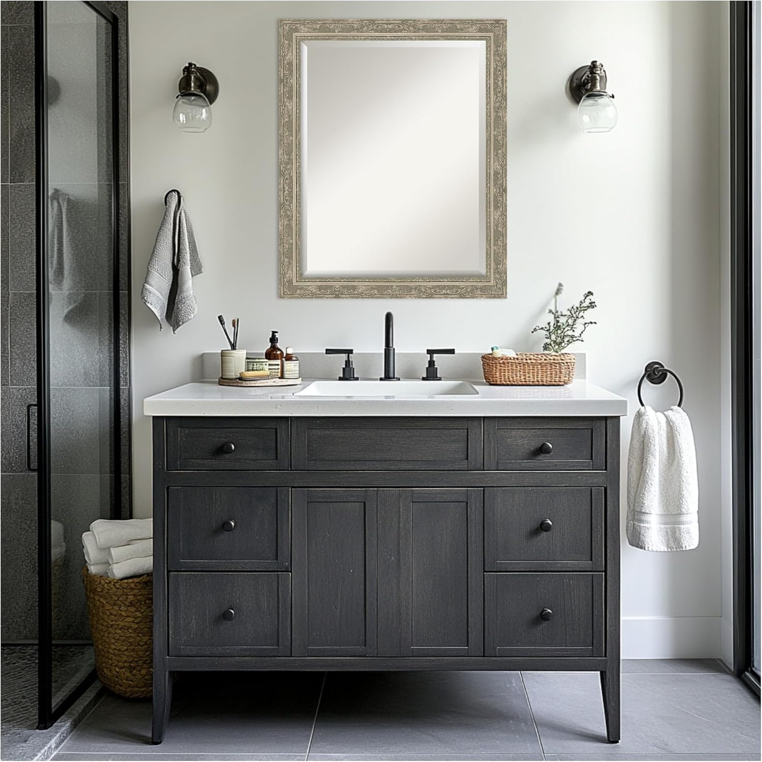 Amanti Art Bathroom Mirror for Over Sink, 27x33 Filigree Silver Rectangle Vanity Mirror, Large Traditional Frame, Hangs Horizonally and Vertically, Bathroom Wall Decor, Beveled Edge
