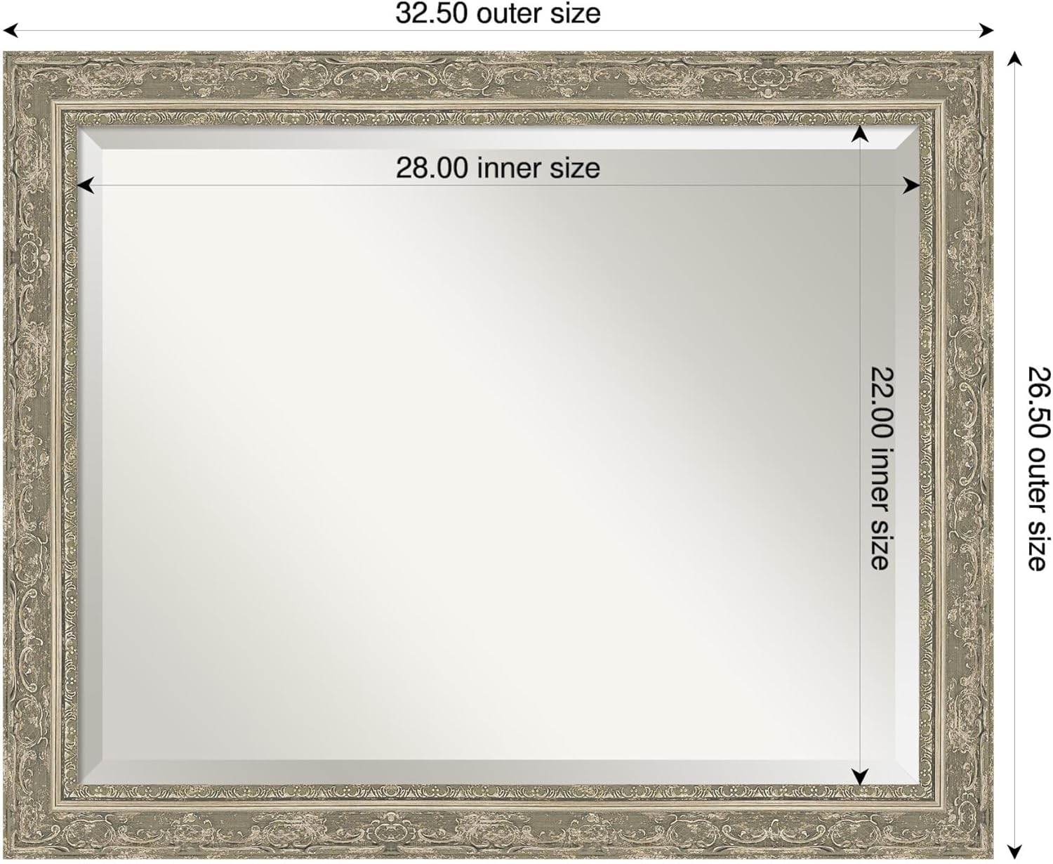 - MIRROR DETAILS: This mirror features premium glass for a clear, undistorted image and is finished with a beveled edge to give the glass a decorative touch. The overall size of this bathroom mirror measures exactly 32.5 x 26.5 inches, including the frame. Its reflective area measures 28 x 22 inches.