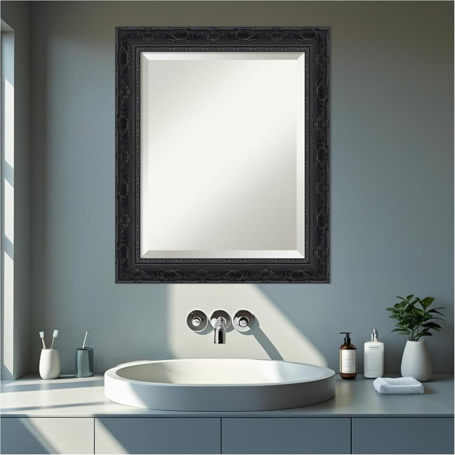 Amanti Art Bathroom Mirror for Over Sink, 25x21 Filigree Gloss Black Rectangle Vanity Mirror, Small Traditional Frame, Hangs Horizonally and Vertically, Bathroom Wall Decor, Beveled Edge