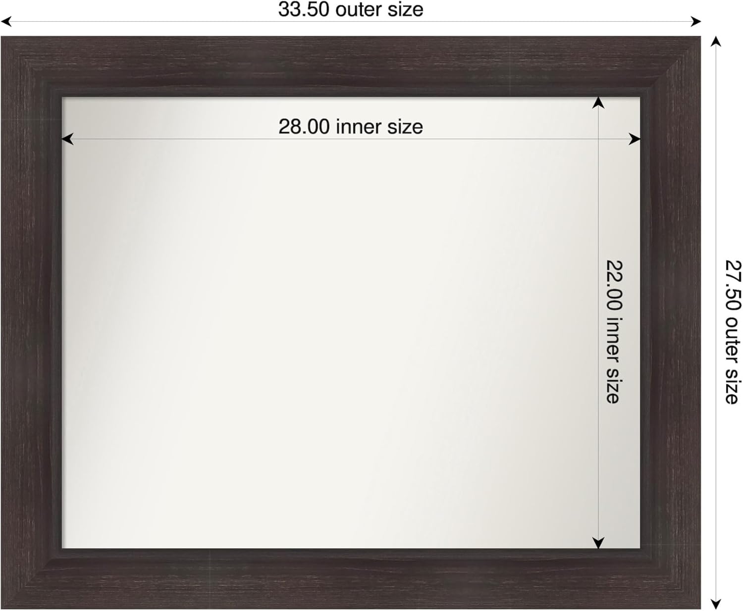 - MIRROR DETAILS: This mirror features premium glass for a clear, undistorted image and has a non-beveled surface to maximize the viewing area. The overall size of this bathroom mirror measures exactly 33.5 x 27.5 inches, including the frame. Its reflective area measures 28 x 22 inches.