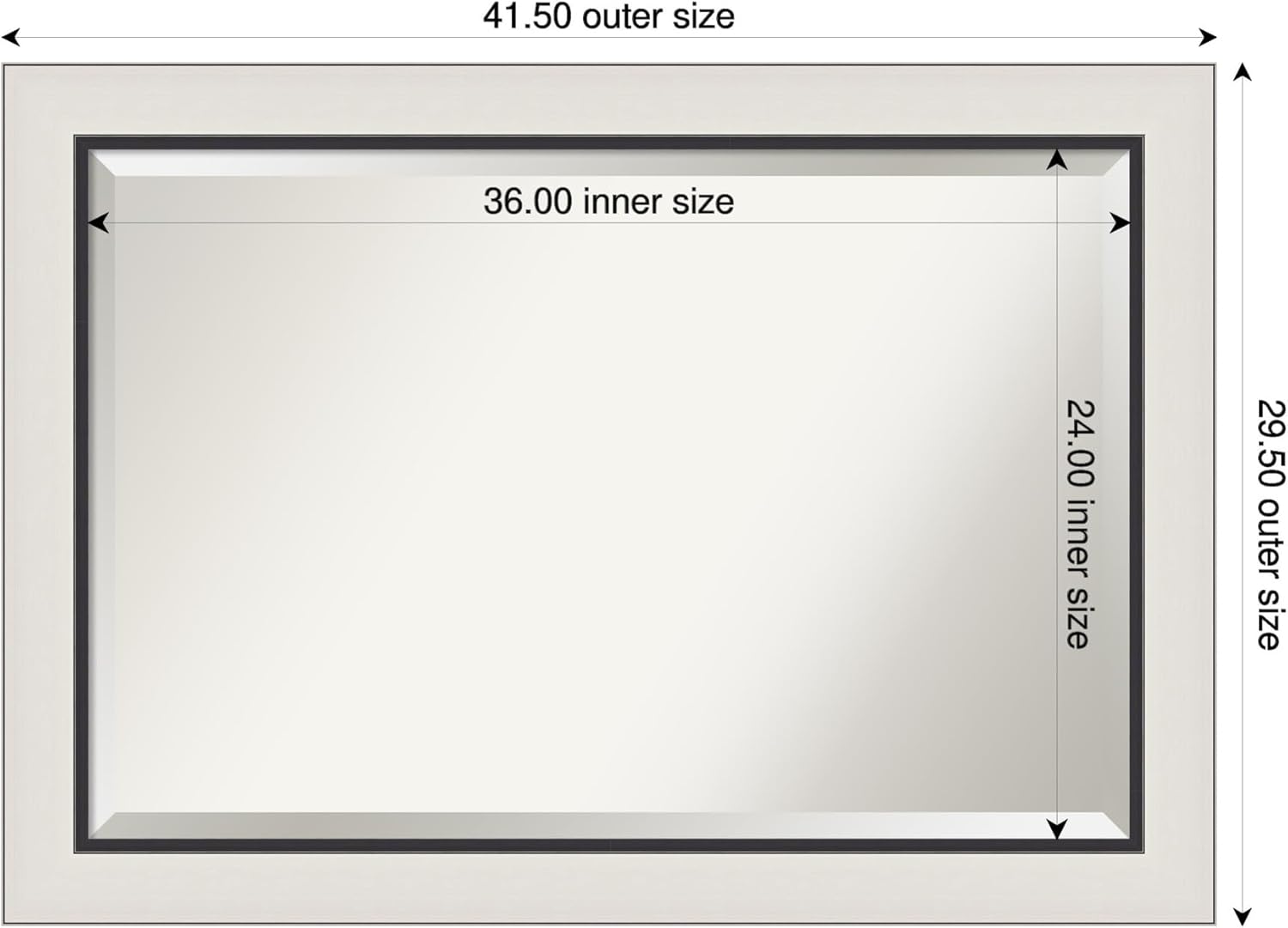 - MIRROR DETAILS: This mirror features premium glass for a clear, undistorted image and is finished with a beveled edge to give the glass a decorative touch. The overall size of this bathroom mirror measures exactly 41.5 x 29.5 inches, including the frame. Its reflective area measures 36 x 24 inches.