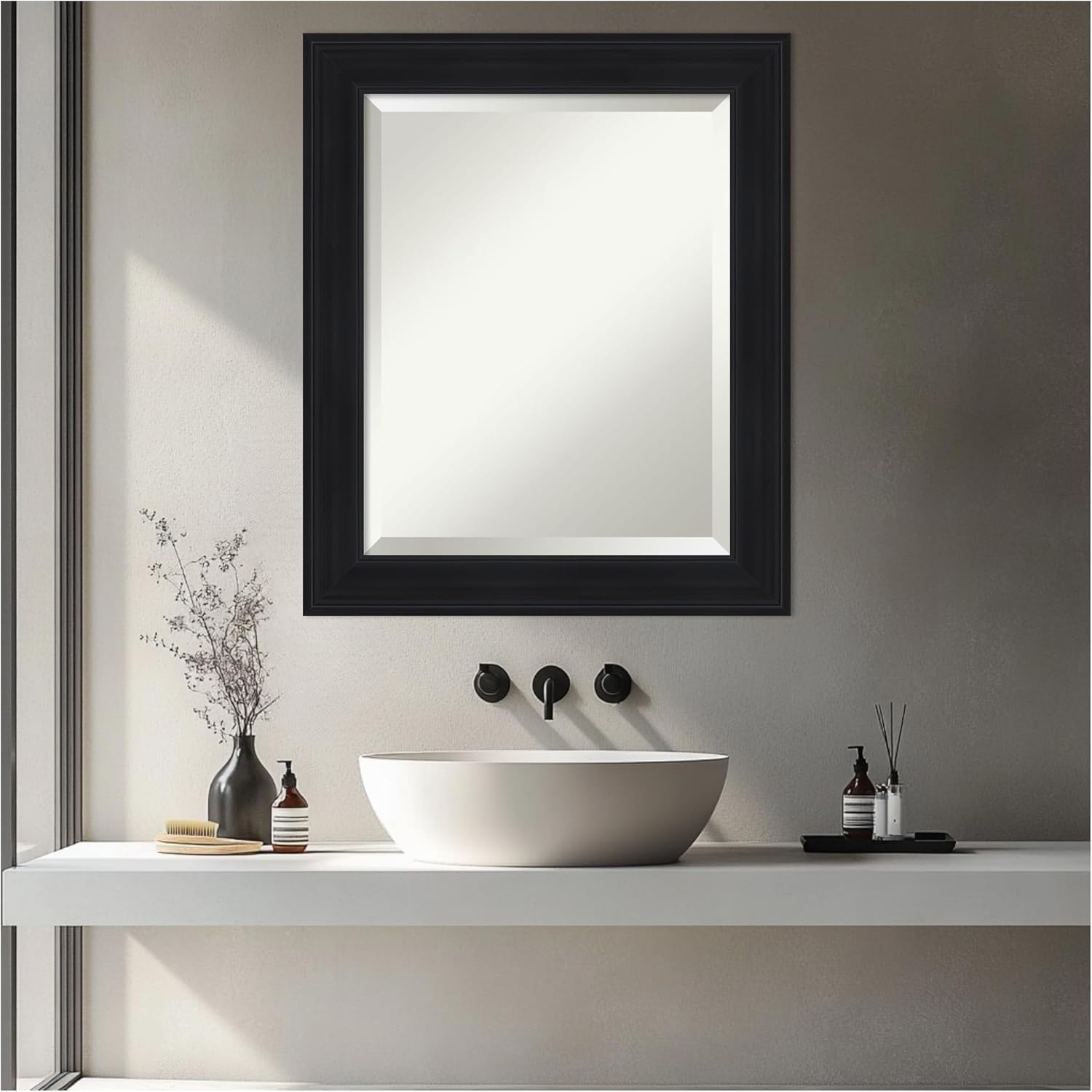 Amanti Art Black Bathroom Mirror for Over Sink, 25x21 Abbey Black Rectangle Vanity Mirror, Small Traditional Frame, Hangs Horizonally and Vertically, Bathroom Wall Decor, Beveled Edge