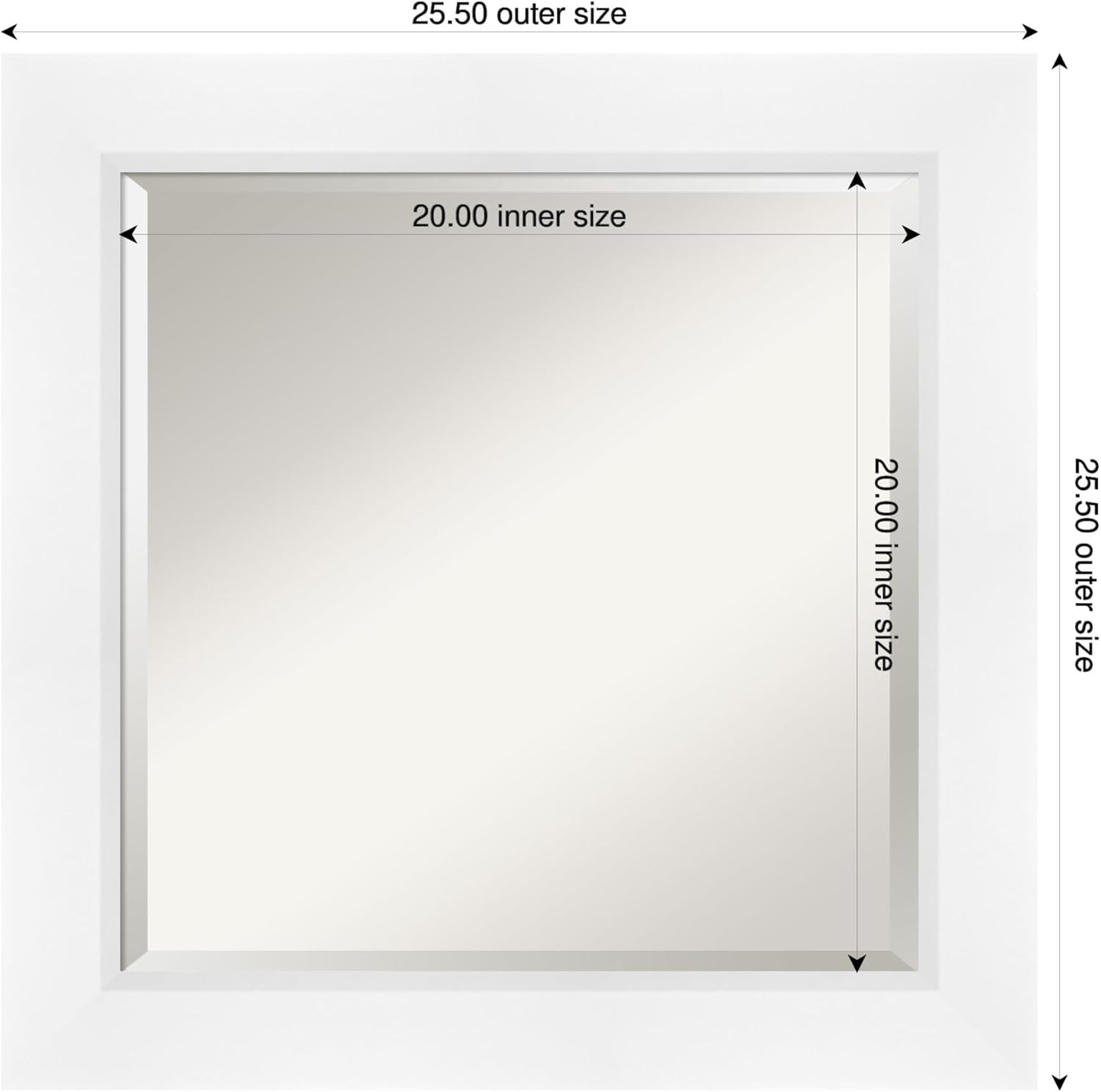 - MIRROR DETAILS: This mirror features premium glass for a clear, undistorted image and is finished with a beveled edge to give the glass a decorative touch. The overall size of this bathroom mirror measures exactly 25.5 x 25.5 inches, including the frame. Its reflective area measures 20 x 20 inches.