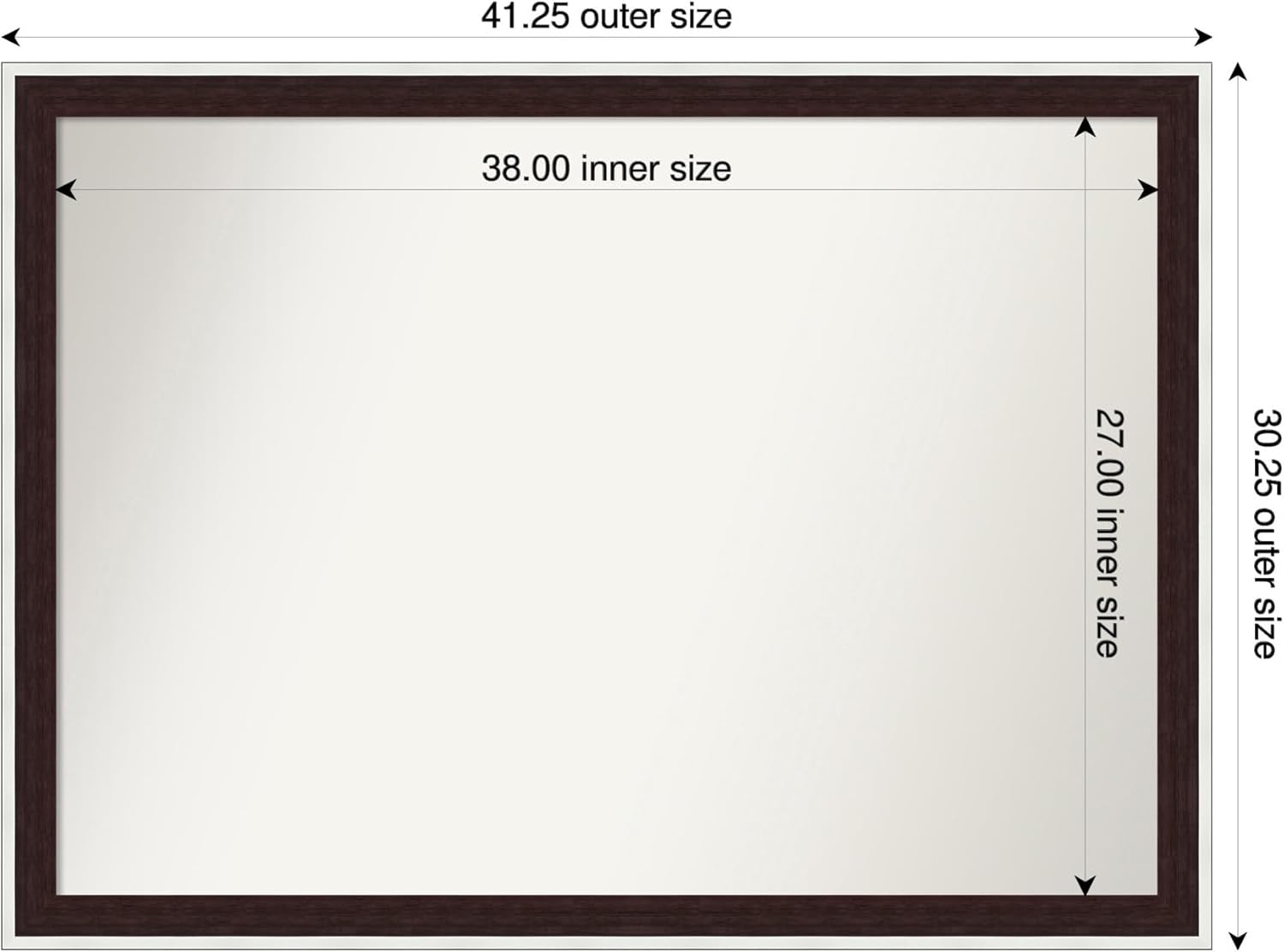 - MIRROR DETAILS: This mirror features premium glass for a clear, undistorted image and has a non-beveled surface to maximize the viewing area. The overall size of this bathroom mirror measures exactly 41.25 x 30.25 inches, including the frame. Its reflective area measures 38 x 27 inches.