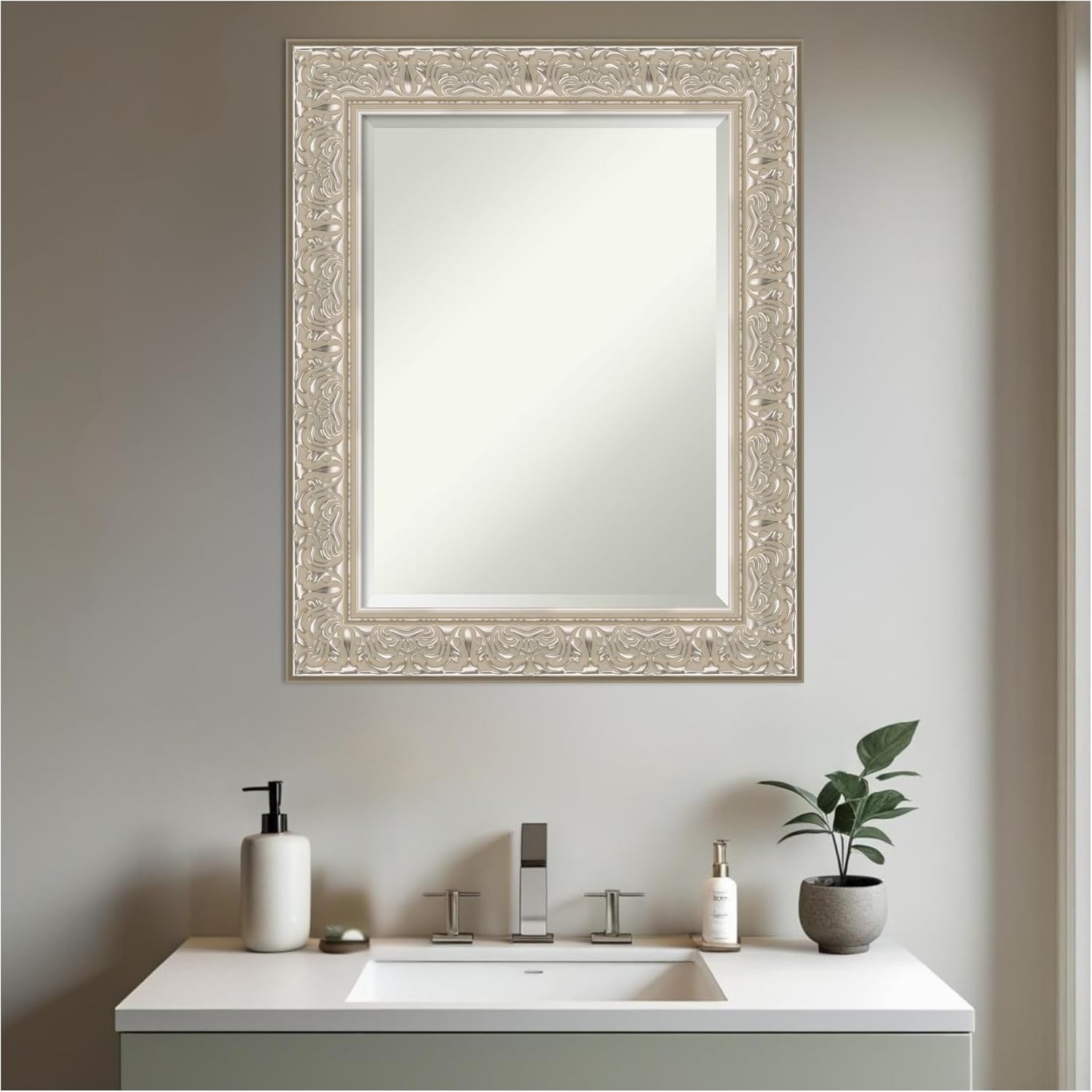Amanti Art Silver Bathroom Mirror for Over Sink, 31x25 Luxe Silver Cream Rectangle Vanity Mirror, Medium Traditional Frame, Hangs Horizonally and Vertically, Bathroom Wall Decor, Beveled Edge