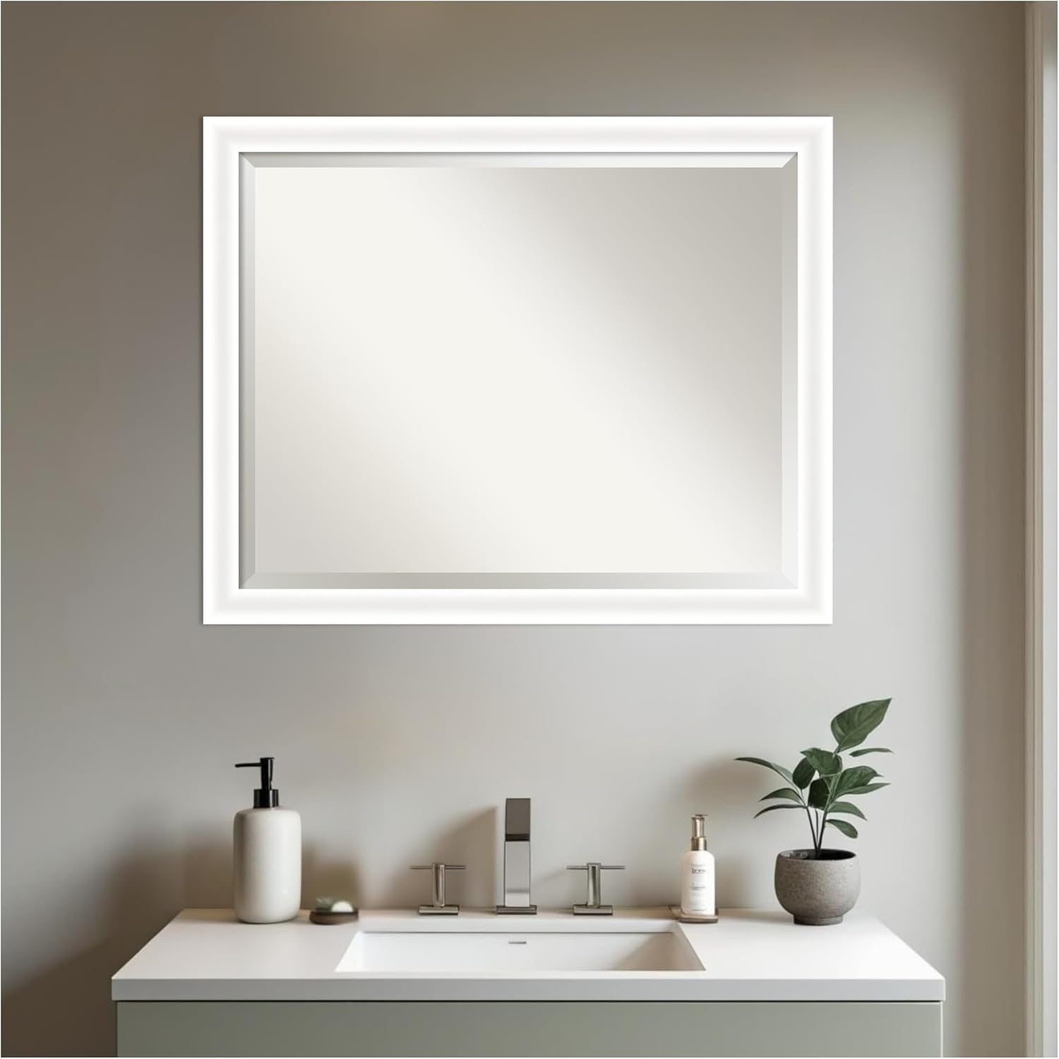 Amanti Art White Bathroom Mirror for Over Sink, 25x31 Oliver White Narrow Rectangle Vanity Mirror, Large Modern Wood Frame, Hangs Horizonally and Vertically, Bathroom Wall Decor, Beveled Edge